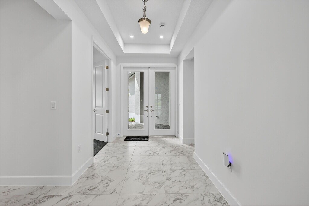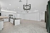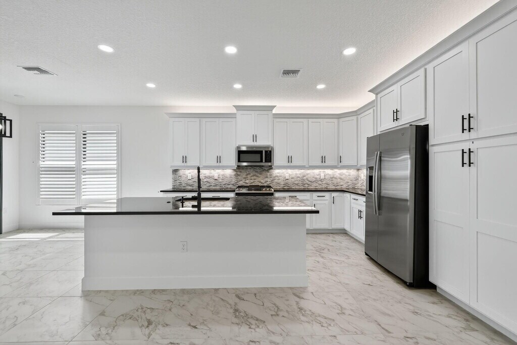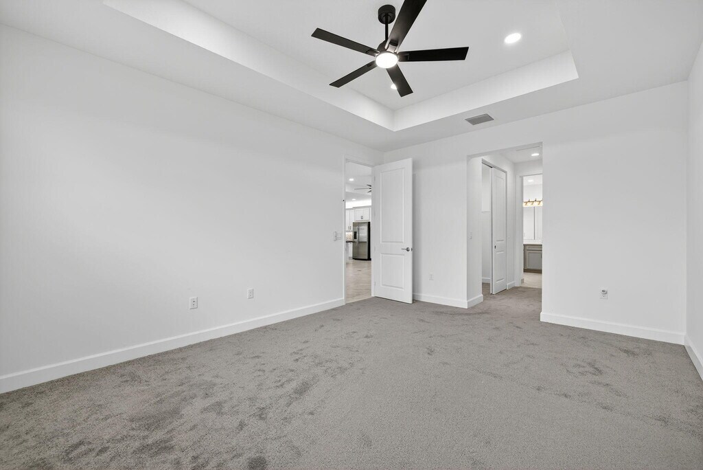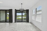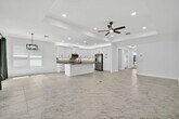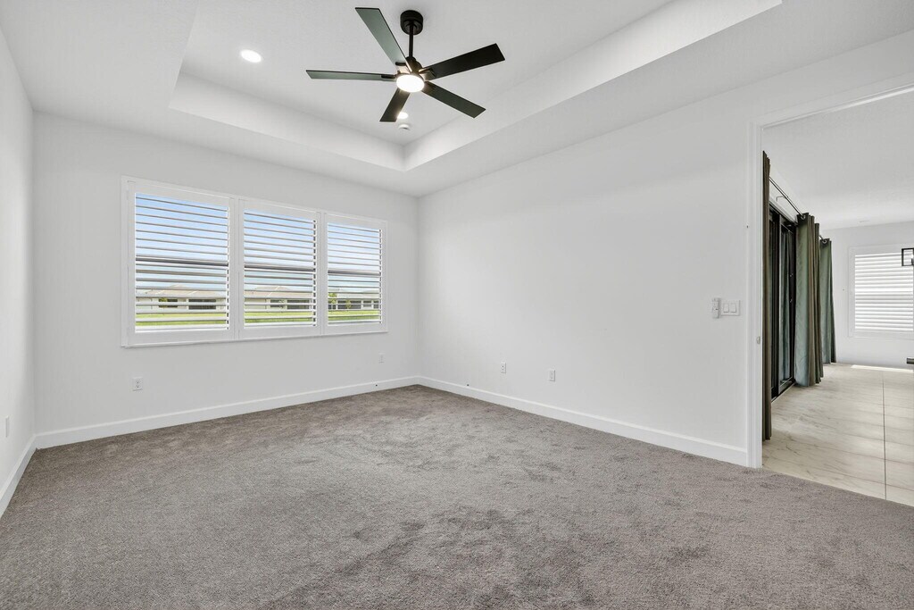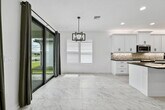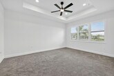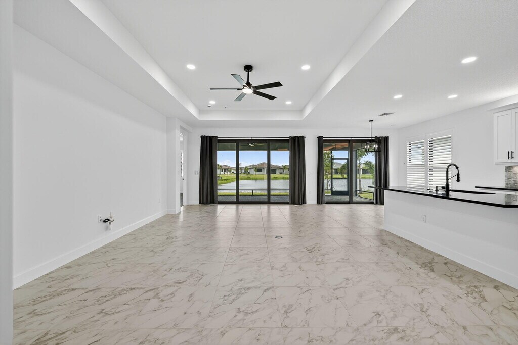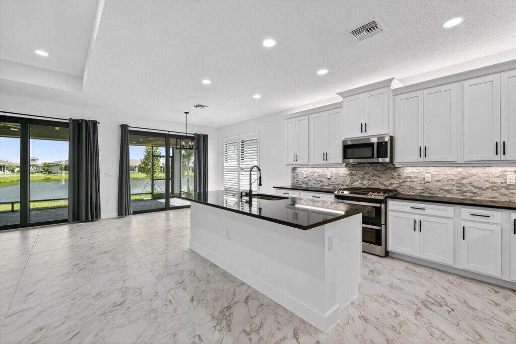 NEW FOR RENT - - Available now! Step into this brand-new, never-lived-in waterfront Palazzo model in GL Homes' newest 55+ community, Valencia Parc. Designed for both comfort and elegance, this residence offers three spacious bedrooms plus a versatile den, two and a half bathrooms, and the convenience of a golf cart garage. From the moment you enter, tray ceilings in the foyer, main living area, and primary suite set an elevated tone. The bedrooms and den feature soft, dark gray carpeting, while the main living spaces are enhanced with thoughtful details, including a living room floor outlet perfectly positioned for a recliner or sofa. The kitchen is a true highlight, boasting white soft-close cabinetry topped with crown molding and beautiful uplighting, contrasted by sleek