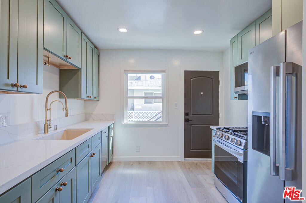 Available Now -Private Beautiful Upper Rear 2 bed! This upper rear 2BR is the most private and spacious residence in a quiet boutique fourplex. The interior has been completely reimagined with wide-plank LVP flooring, soft arches, warm brass hardware, and gallery-smooth walls. Features include: Upper-rear 2BR offering maximum privacy and quiet, Three exposures with balanced natural light, Wide-plank LVP flooring with warm, modern finish, Soft arches + gallery-smooth walls, West-facing living room windows, Dedicated dining area, LG stainless appliance suite: French-door fridge w/ water + ice, Gas convection oven, Microwave with vent, Stainless dishwasher, Sage-green cabinetry + antiqued brass knobs, Bisque quartz undermount sink with garbage disposal + brass sprayer faucet, Custom vertical tile bathroom with marble vanity, Frameless shower enclosure + hand wand, Quiet, vented bathroom fan, Dual-flush toilet, Private garage (fresh paint, new drywall, remote-controlled door), On-site laundry (coin-op: $3.75 wash / $2.50 dry), Young citrus along the rear stair, Fence planted for future bougainvillea + climbing rose, Mature trees creating quiet rear backdrop, New windows + doors, No pets, Renters' insurance required, Move-in: first month + maximum allowable security deposit. MLS# 25627595