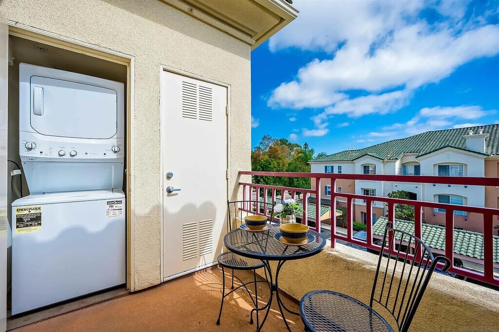 Enjoy top-floor living in the heart of Carmel Valley Enjoy top-floor living in the heart of Carmel Valley! This beautiful 1-bedroom, 1-bath condo offers a rare advantage with two dedicated parking spaces. The home features dramatic vaulted ceilings and a bright, open-concept layout filled with natural light. Both the spacious living area and large bedroom open to a private balcony, and the unit includes convenient in-unit laundry.Residents have access to resort-style amenities such as a sparkling pool, relaxing hot tub, and fully equipped fitness center. Ideally located near premier shopping and dining, with easy access to I-5 and SR-56, this home puts all of San Diego within easy reach. Don’t miss this exceptional blend of comfort, style, and convenience!