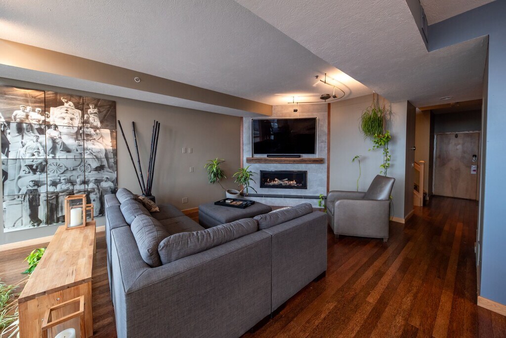 Welcome to urban living at its finest! This sophisticated and modern penthouse condominium offers a perfect blend of style, convenience, and comfort. Situated in a prime location, this 2-bedroom, 2-bathroom unit boasts stunning views of the city skyline and is just steps away from vibrant restaurants, entertainment, and cultural attractions. The open floor plan is flooded with natural light, creating a warm and inviting atmosphere. Step into the sleek and well-appointed kitchen, featuring stainless steel appliances, granite countertops, and ample storage space. The living and dining areas seamlessly flow together, providing an ideal space for entertaining guests or enjoying a quiet night in to enjoy the amazing fireplace. The spacious master suite on the second floor is a true retreat, complete with a private ensuite bathroom with steam shower and generous closet space. Walkout directly to the attached rooftop terrace. The second bedroom is versatile, perfect for guests, a home office, or a cozy den. Full size in suite washer and dryer are included. The building boasts excellent amenities that include a fitness center, security and concierge service, communal spaces, and convenient dry cleaning pickup/drop-off. The unit also comes with indoor secure parking for your convenience. This amazing penthouse is being rented fully furnished and equipped and for a minimum of 12 months. Inquire if interested in renting unfurnished.