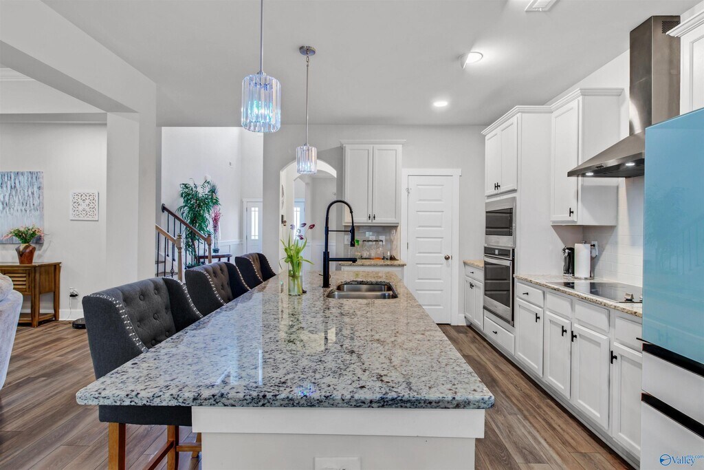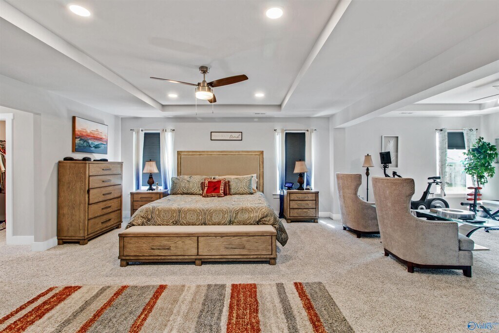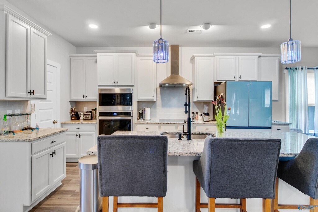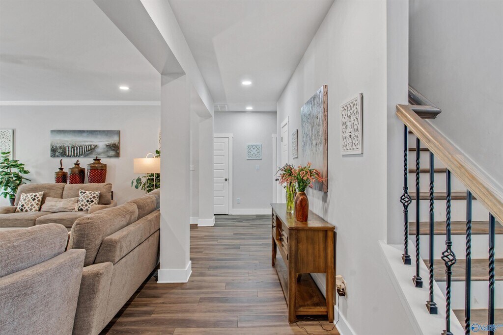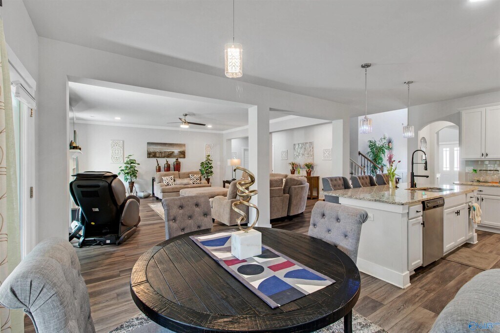 This elegant 5-bedroom/4-bathroom home is located minutes from Redstone Arsenal and Towne Madison. The chef-inspired kitchen boasts stainless-steel appliances,an overly large island,and an eat-in area that flows into the open great room,a private en-suite bedroom,a formal dining room,and a Butler’s Pantry. The expansive 900 sq ft Primary Bedroom is combined with a sitting area,two walk-in closets,and an exquisite bathroom. Enjoy time in the upstairs bonus room. The backyard is an oasis for entertainment,relaxation,or a vacation at home,featuring a screened-in back patio,a cozy fireplace,a large backyard,and your own Koi Pond.