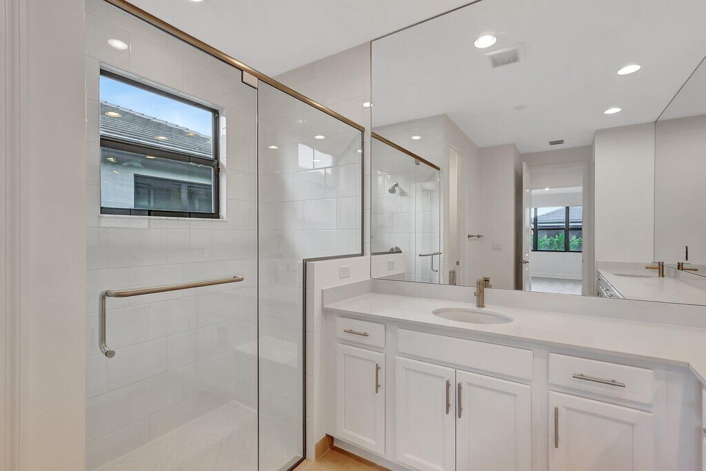 Enjoy this spectacular GL home in a premier exciting community! Sandpiper model with open, bright floorplan featuring 2 bedrooms plus den with pocket doors. Gorgeous custom upgraded kitchen with white cabinets, SS appliances, quartz counters and backsplash. Impact windows throughout. Gas oven with grill. Spectacular high end wood looking plank flooring throughout entire house. Large master bath with glass shower doors, neutral tile, mirrors to the ceiling and double vanities. Custom modern window treatments and blinds. Private screened patio with beautiful pavers to enjoy the outdoors. Separate laundry room, 2 car garage. Enjoy resort style living at the fabulous Valencia Walk club house. World class amenities include resort style pool, restaurant & outside bar.