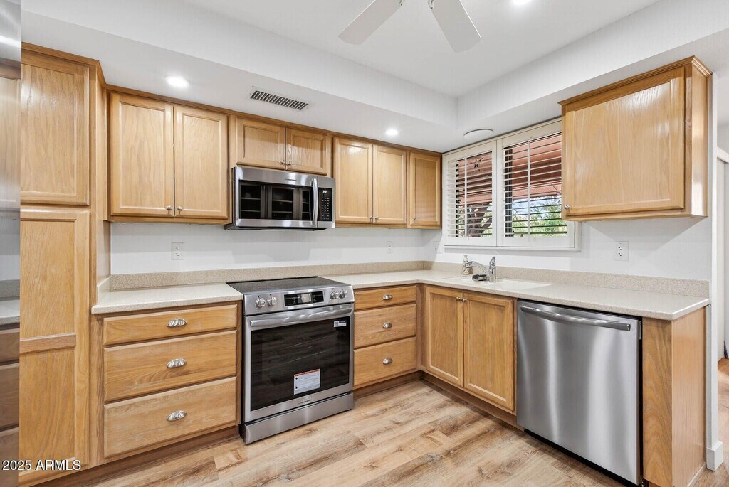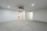 This Sun City West home shines with new luxury plank floors,fresh paint,new carpet in the bedrooms,and updated fixtures throughout. The kitchen features beautiful cabinets,new stainless appliances,a cozy breakfast room,and a pass-through to the covered patio - perfect for casual meals or entertaining. The split layout offers privacy with spacious bedrooms,all with walk-in closets - one with direct back patio access. The primary suite includes dual walk-in closets,a charming vanity area,and private entry to the gated courtyard. Updated bathrooms,a flexible utility space,added attic insulation,and solar complete this comfortable,efficient,and truly inviting home!