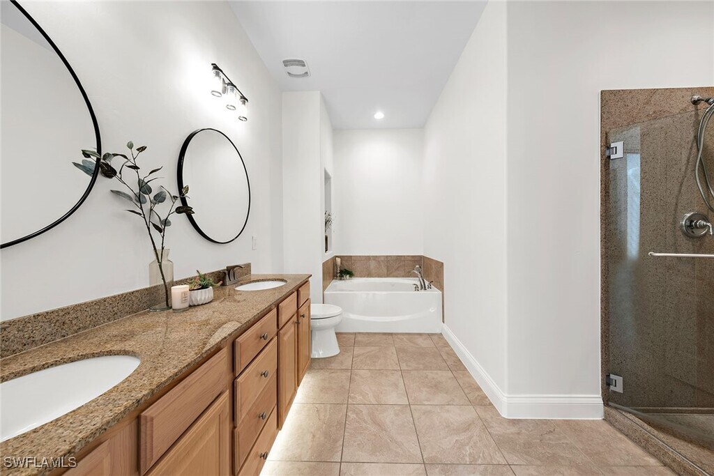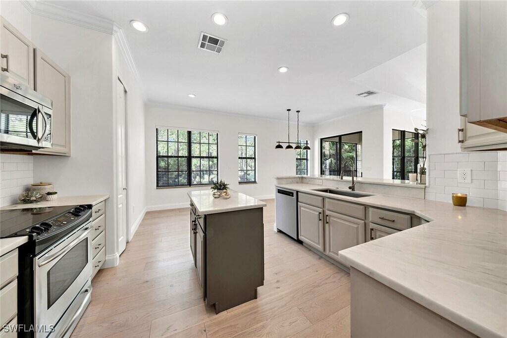 Welcome to Gusto Bella Vita,a beautiful community that combines luxury and convenience in a serene setting. This sought-after second-floor unit is a true gem,featuring vaulted ceilings and an open-concept layout that invites natural light throughout. Freshly painted and adorned with stylish new lighting and ceiling fans,this three-bedroom,two-bathroom residence is designed for comfortable living. The state-of-the-art kitchen boasts top-of-the-line stainless steel appliances and elegant granite countertops,seamlessly connecting to the spacious living and dining areas with 10' ceilings. Enjoy tranquil mornings from the screened lanai,where you can take in breathtaking preserve views through large picture windows facing Northeast. The master bedroom is a sanctuary,featuring generous walk-in closets and a large bathroom equipped with a tub and a walk-in shower. The two additional bedrooms,conveniently located near the entry,offer ample space for family or guests. Additional home highlights include exquisite wood flooring,crown molding,and an attached one-car garage for extra storage. As a resident of Bella Vita,you'll also have access to exceptional community amenities,including a clubhouse with a kitchen,an outdoor pool,a spa,and a fitness center. Ideally located off Pine Ridge Road,this community is just a few minutes away from various restaurants,shopping options,Hospitals,Publix,I-75,and Naples' pristine white sand beaches. Take your chance to experience upscale living in this stunning property in the heart of Naples.
