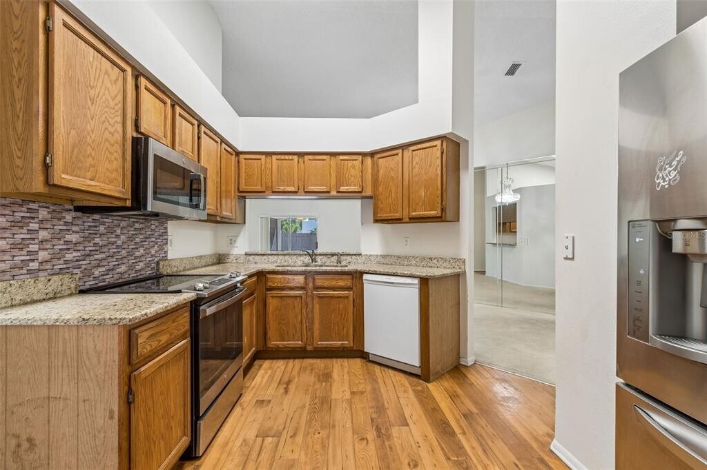 Welcome home to the desirable Northwood community in Wesley Chapel! This light and bright 3-bedroom,2 bath home offers 1,504 sq ft,sought-after split floorplan and a 2-car garage. Tucked away on a lovely cul-de-sac street. Curb appeal welcomes you in,leading to a spacious living area with vaulted ceilings and sliding glass doors that open to a huge,screened lanai,perfect for relaxing or entertaining and overlooking a nicely fenced backyard. The kitchen features granite countertops,ample cabinet and counter space,and a convenient passthrough to the separate dining area. Extensive 2023 upgrades include: new granite countertops in kitchen,new microwave and stove,full interior paint,new ceiling fans throughout,new bathroom light fixtures,new switch plates throughout,new blinds throughout and a new mailbox. Roof and ceilings replaced in 2019. The enclosed lanai upgrades include specialty outdoor metal paint,new wall-to-wall carpeting,new screens,and a new ceiling fan. Additional highlights include a 2-car garage (420 sq ft),walk-in closets,and access to a community pool. Ideally located near Tampa Premium Outlets,The Grove,Wiregrass Mall,and a variety of restaurants,plus zoned for A-rated Pasco County schools! This move-in ready home combines comfort,style,and convenience—schedule your showing today! MLS# TB8499872