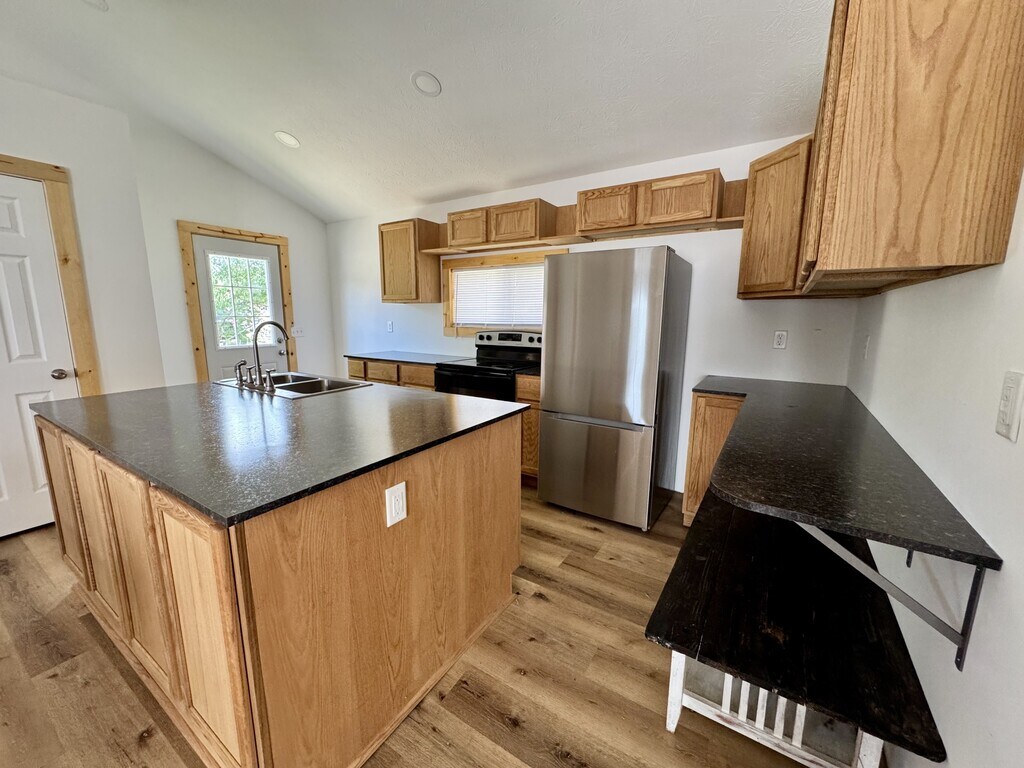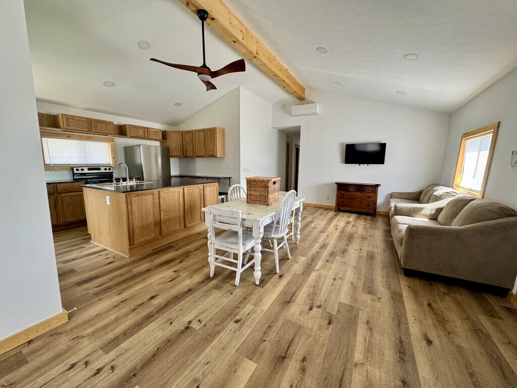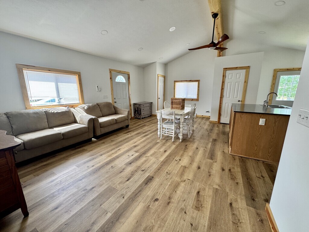 Updated 3 bed, 1 bath home with open floor plan, vaulted ceilings, and wood-style floors throughout. Kitchen features stainless steel appliances and a large island. Off-street parking included. Option to unfurnish is available.