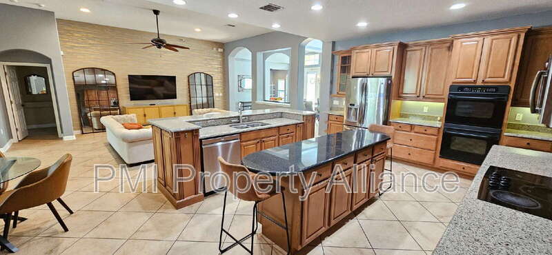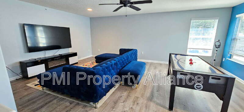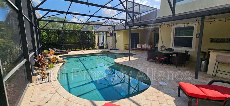 This gorgeous 5BD/4BA M/I “Brookshire II” home in Foxcrest at Stonecrest offers spacious, flexible living with a solar-heated, saltwater screened pool and a built-in summer kitchen—perfect for year-round enjoyment. The open-concept floor plan features a gourmet kitchen with granite counters, 42" cabinetry, double ovens, and stainless appliances, flowing into a large great room with direct access to the pool area. The first floor includes four bedrooms and three baths, while upstairs you'll find a fifth bedroom suite, a huge bonus room, and a dedicated media room with surround sound. The luxurious primary suite offers pool access, tray ceilings, dual walk-in closets, and a spa-like bath with jetted tub, walk-in shower, and double vanities. Energy-efficient upgrades include low-E windows, foam block insulation, a new water heater, and an automatic pool drainage feature. Enjoy a 3-car garage, indoor laundry, and a beautifully landscaped, partially fenced yard. Pool care and lawncare is included. This property is fully furnished. Small pets are welcome. Located near top-rated Winter Garden schools, just minutes from Winter Garden Village, historic downtown, and major highways, with HOA amenities like a resort-style pool, clubhouse, tennis courts, playground, and scenic walking trails. Pet Details: Small pets are welcome