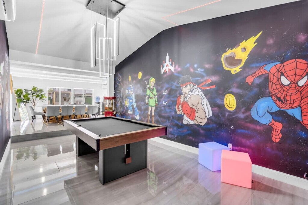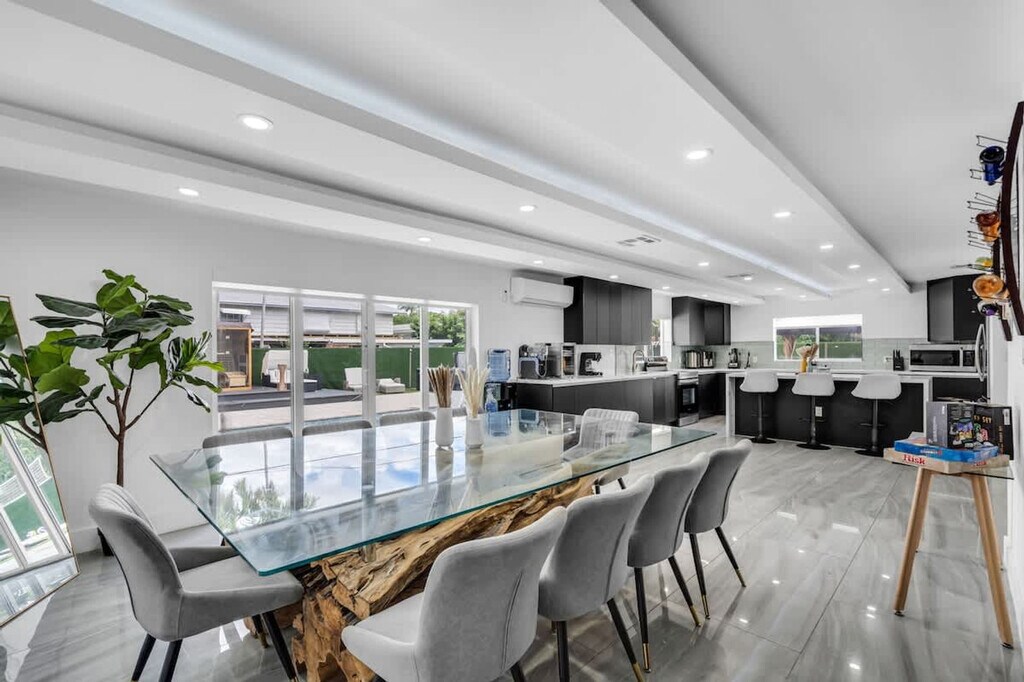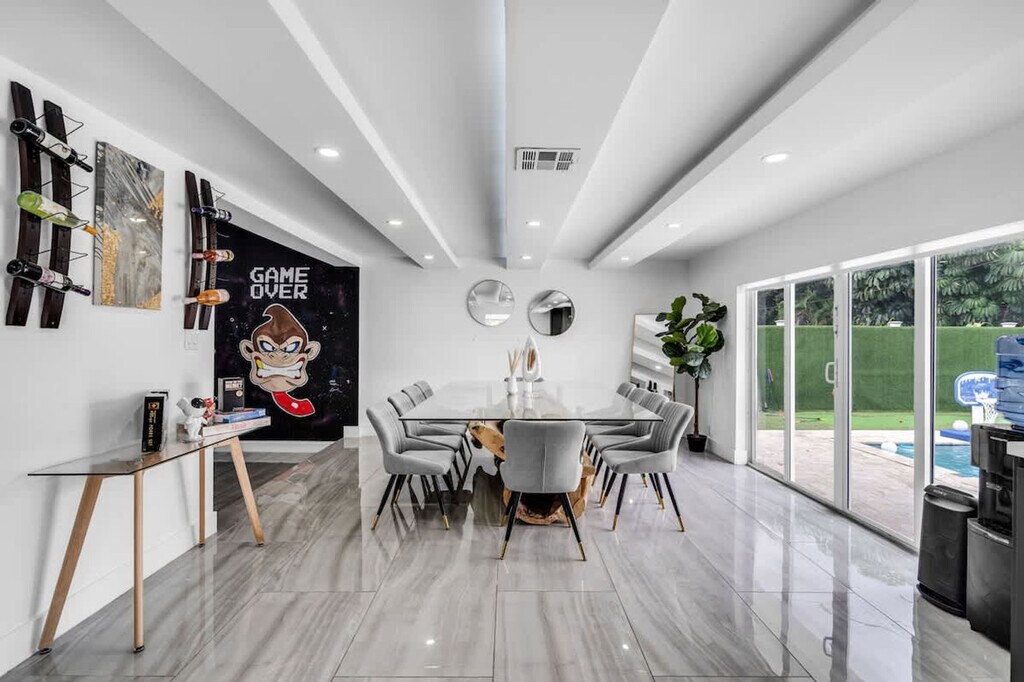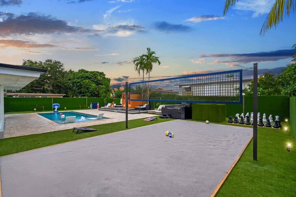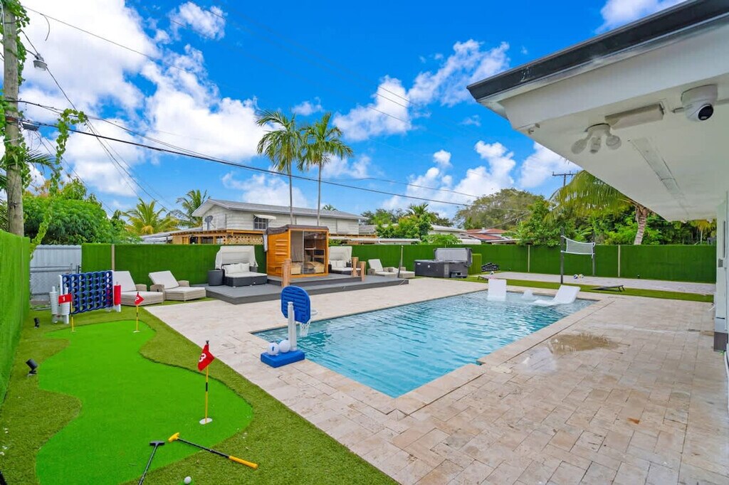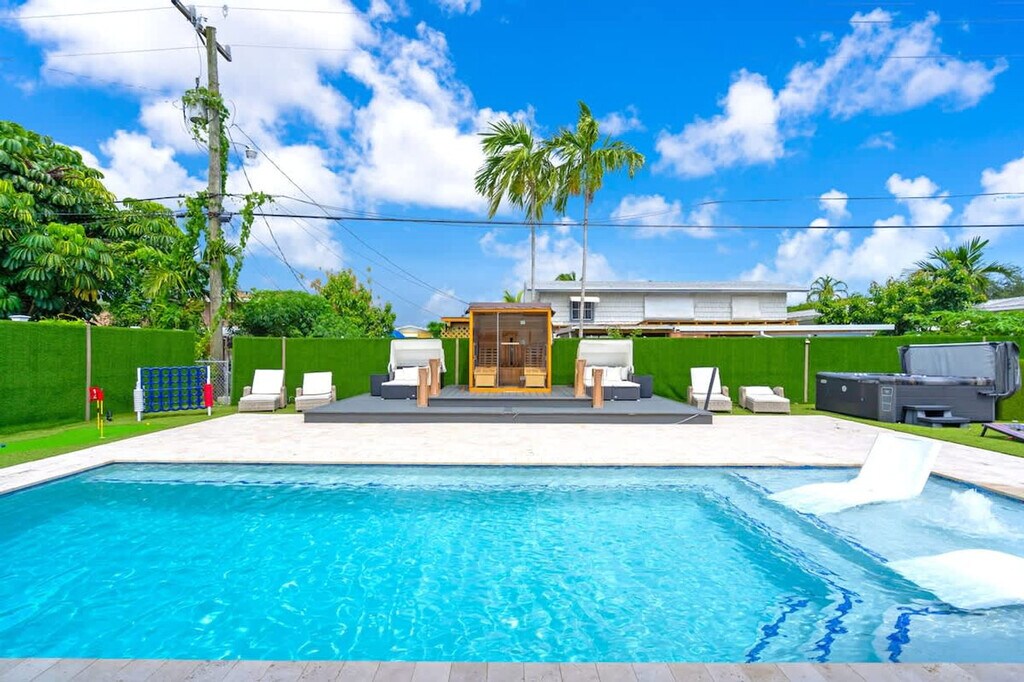 Welcome to your ultimate getaway in the heart of Miami. Feel at home in this 5-bedroom home thoughtfully designed for comfort, relaxation, and fun. This home features unique amenities including a private pool, jacuzzi, sauna, mini golf, ping pong, half volleyball court, life-size chess game, and a state-of-the-art game room with a pool table, arcades, and more. All bedrooms are equipped with Smart-TVs. Extra air mattresses can be provided upon request. This is a pet-friendly property; please indicate how many pets you are bringing before booking. Centrally located in Miami, this home is 2 miles from Aventura's food and restaurants, 5 miles from the beach, and 13 miles from FLL Airport. Driveway parking is available for up to 4 cars; please do not park on the street or grass, as the city will issue a fine. Please clean up after using the BBQ; if the grill is not cleaned, an extra $50 cleaning fee may apply. Smoking is not allowed inside the house. The landscaper will enter the property for scheduled lawn maintenance every 15 days, and the pool technician will conduct pool maintenance twice a week. These services are automatic and non-intrusive. [SI]
