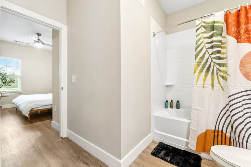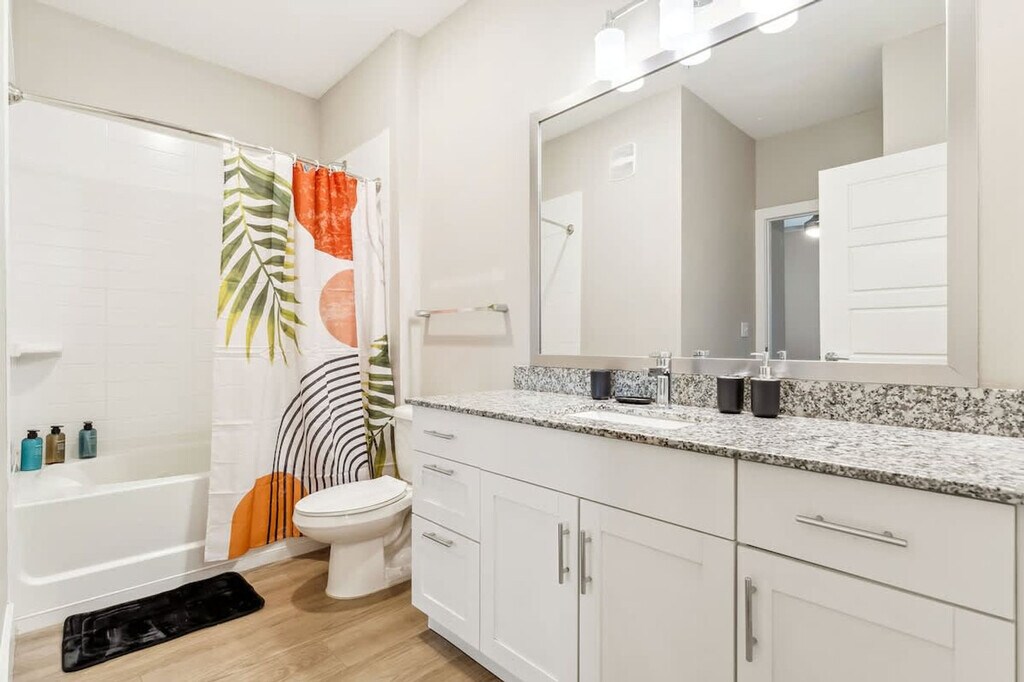 Feel at home in this modern 1-bedroom, 1-bathroom apartment in Orlando. This chic and cozy apartment offers the ideal base for your Florida adventure, combining comfort with convenience and featuring easy access to nearby theme parks, shopping, and dining options. The apartment features a bright and airy living space with ceiling fans in both the living room and bedroom, an open floor plan with upgraded flooring and stylish tile accents, and a screened-in patio. The living room includes a queen-size sofa bed, accommodating 2 additional guests, and a flat-screen 50” TV. The fully equipped kitchen features energy-efficient stainless steel appliances, sleek granite countertops, a refrigerator, stove, microwave, coffee maker, blender, toaster, cookware, and utensils. The spacious bedroom offers a king-size bed with premium linens, a large walk-in closet with iron and ironing board, a ceiling fan, and a 43” flat-screen TV. The full bathroom includes a spacious bathtub and essential amenities: toilet paper, shampoo, conditioner, shower gel, hand soap, towels, and hairdryer. Luggage drop-off is available after 12:30 PM with advance notification. Pets are welcome, however upon making the reservation you have to provide a scan or photo of the up-to-date dog vaccination, rabies shot, and general basic info about the dog. Make sure to add your pets in the reservations and the pet fee will automatically apply to your total. Enjoy the pool, stay active in the gym, or explore nearby attractions like Disney. The apartment is close to shopping, dining, and major Central Florida hotspots. Quiet hours are between 10:00 PM and 8:00 AM. Breed restrictions apply for pets: Pit Bull Terriers, Staffordshire Terriers, Rottweilers, Doberman Pinschers, Chows, Presa Canarios, Akitas, Alaskan Malamutes, and Wolf-Hybrids. [SI]