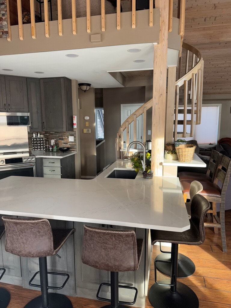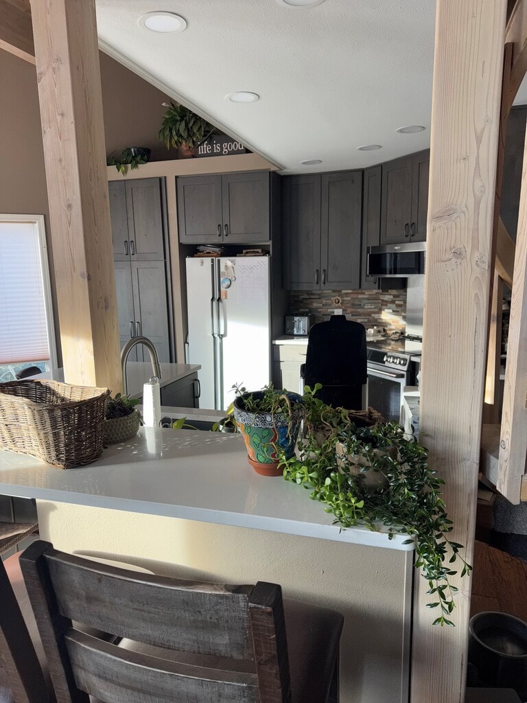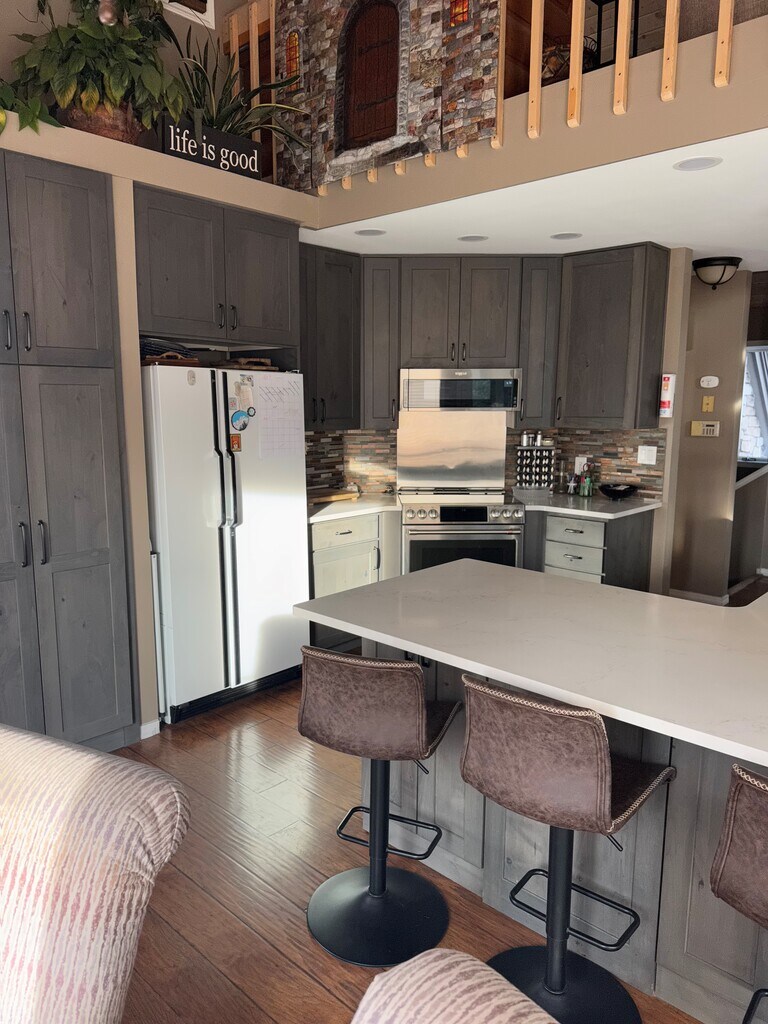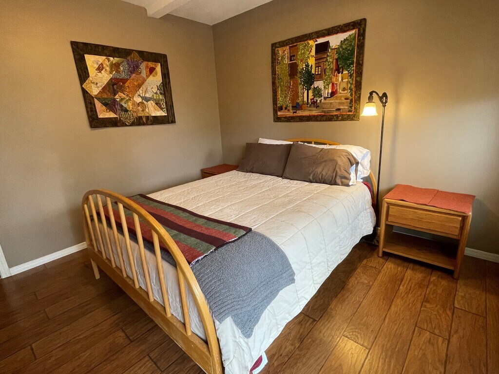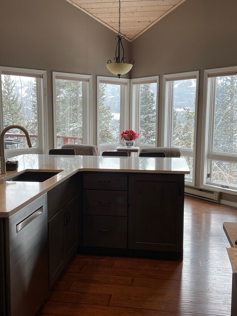 Enjoy this gorgeous, fully furnished, 2,500 sq ft home with sensational views of Breckenridge Ski Area and 10 Mile Range. Only 3 minute drive to town and the Gondola for easy slope access. This home is the outdoor enthusiast's dream! Trails are right outside your door awaiting your every outdoor activity (snow shoeing, back country skiing, cross country skiing, etc). Soak in the best of the afternoon sun and magnificent sunsets from multiple private decks. Enjoy the hot tub to kick off or cap off your day. 3 bedrooms, 4 bathrooms, 3 workstations, newly remodeled and fully equipped kitchen with counter seating. The expansive living room and dining area with vaulted ceilings, sunroom with indoor hot tub, and loft offer multiple gathering spaces with comfortable lounging options. Two wood burning fireplaces assist in the ambiance and heating. GROUND LEVEL: Enter the ground level where you will find a suite-style bedroom with queen bed, private bath with bath tub, and private deck, another bedroom with a twin bed, another bathroom, large walk-in closet for all your gear, sunroom with hot tub and two swinging chairs, and large laundry/mud room. MAIN FLOOR (2nd floor): Choose from two sets of stairs on either end of the house to ascend to the main floor with spacious, great room (living and dining) that extends into the open-air kitchen with all new appliances, cabinets, counter tops, and kitchen-ware. Gather 'round the kitchen counter with 7 counter top and bar level chairs. The 'International Coffee Nook' beckons you to relax in the oversized chairs on the 'bow of the ship' with mountain views galore. Master bedroom and bathroom are located on this upper floor as well. LOFT: From the main floor, climb the spiral staircase up to the loft with two large workstations, queen sized, pull-out couch, sitting/reading area, and 'tree top perch' deck. 3-min drive to town and Breckenridge Ski Area. 20 minutes to Keystone, 30 minutes to Copper or A-Basin. 40 minutes to Vail. 50 minutes to Beaver Creek. Not on bus route. Four-wheel drive highly recommended. 30-60 day lease available January 12-March 13. Price will be prorated according to length of stay. 5 people and 3 cars maximum. Uncovered, driveway parking. 4-wheel drive highly recommended. Inquire about shorter or longer term stays.