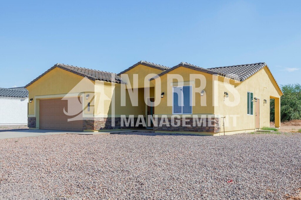 Welcome to your brand new never been lived in home in Arizona City. The home features all appliances including refrigerator, dishwasher, electric stove and microwave. Upon entering the front door you will find very clean tile flooring all throughout the home, with a big island for entertaining. This is a split floor plan with the secondary bedrooms on one side of the home with a full bathroom right off the living area. One bedroom has a door access to the outside of the home offering privacy for one of your guests. The sliding back door opens to a dirt lot with no rear yard fencing. You will need to bring your washer and electric dryer to hook up in the home. The garage holds two cars with an area for storage. Tenants are responsible for electric, water, sewer and trash. Pets are allowed with a $200 non-refundable pet fee for the first pet and $100 for the additional pet. Security deposit is based on credit, background and rental history. Virtual Tour Link: