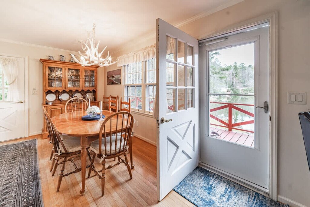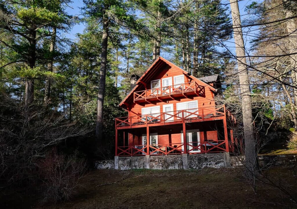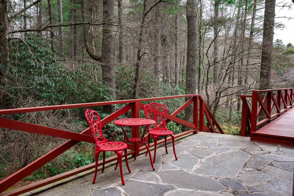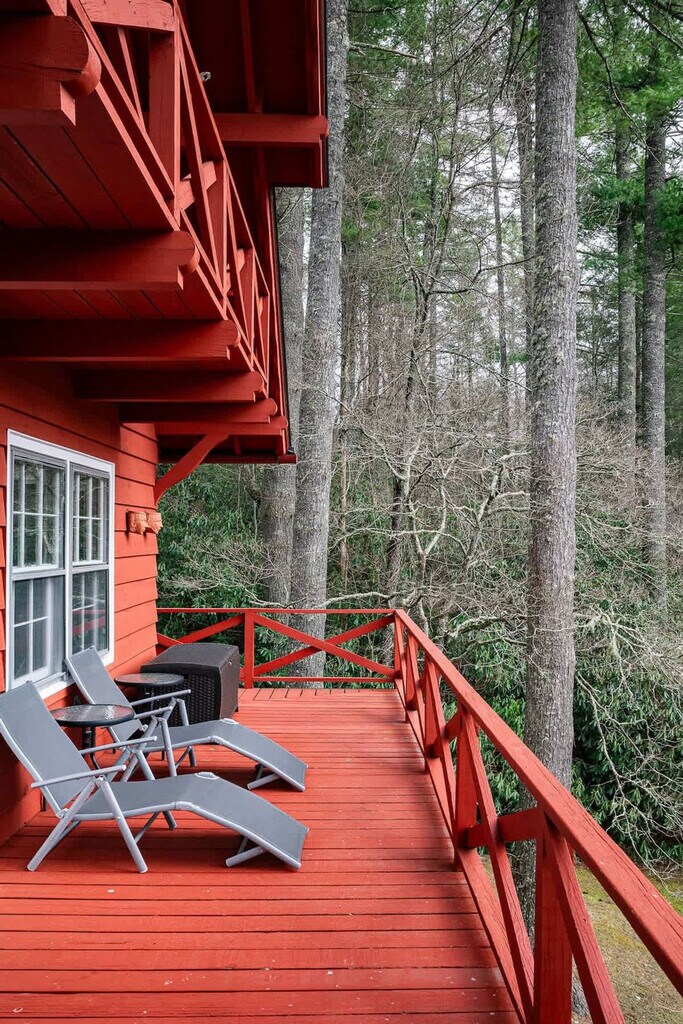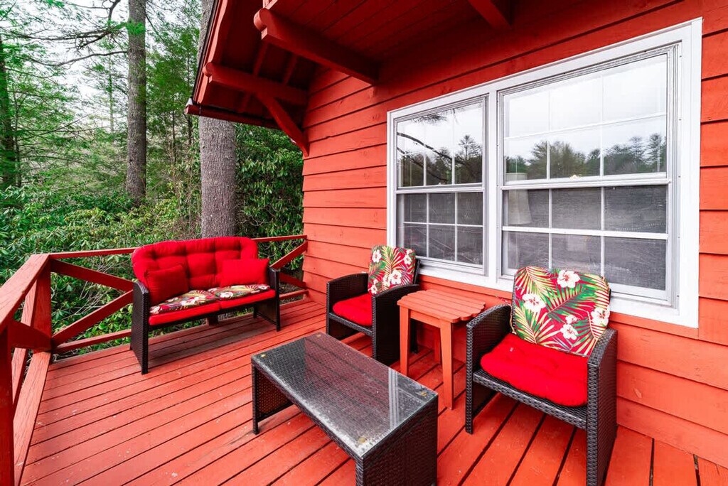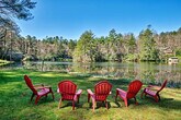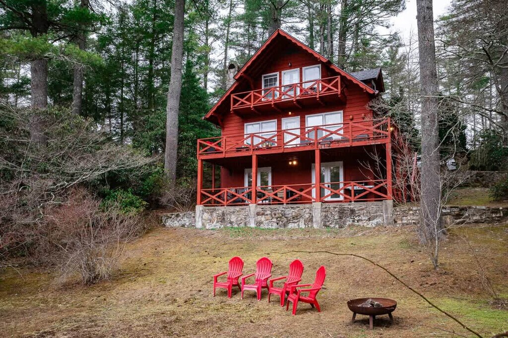 Feel at home in Maison Rouge, a mid-century lake house with a smart layout, real privacy, and a tranquil vibe. Tucked into the trees on Mirror Lake, this home features 4 bedrooms and 3 full baths. Reminiscent of a quaint Swiss chalet, Maison Rouge has been in the same family since it was built in 1965. Situated on a private lakefront wooded acre of lush Rhododendrons, Dogwoods, fragrant Carolina cherry laurels, azaleas, and pine trees, this waterfront home has enviable unobstructed views of Mirror Lake. The main floor galley kitchen is fully equipped with under-cabinet lighting, oven/range, dishwasher, microwave, coffee maker, toaster oven, glassware, a complete set for 12 of fine china, cutlery, bake-ware, pots, pans, a stock pot, and a few pieces of 100 year-old seasoned cast iron cookware. The living room opens to a large wrap-around deck and has a gas-fired stacked-stone fireplace, flat-screen TV, DVD/VHS player with 5-disk CD player and AM/FM. The home is wired for Internet, cable and Smart TV. The lower level has an open family room with entertainment kitchen, gas fireplace, flat-screen TV and full bath. A terrace with Weber gas grill and dining table (seats 6) is also on the lower level, along with a washer and dryer. There is a flat-bottom boat, and life jackets and paddles are located in the storage room. Fishing is catch and release. Maison Rouge is conveniently located within walking distance (a little less than 1 mile) or a 3-minute drive from downtown Highlands, the ideal destination for romance, girlfriend getaways, families and leisure groups. There is no smoking of any kind in the unit, and there will be an automatic $500 cleaning fee if there is any smoke smell inside of the unit. If you smoke, please do so off of the property, at least 15 feet away from any doors/windows. There is an automatic $100 late check-out charge if you're still in the property 20 minutes after check-out. If septic tank rules are not followed and result in a backup, the tenant will be held responsible for repairs. There is a 50lbs pet weight limit. [SI]