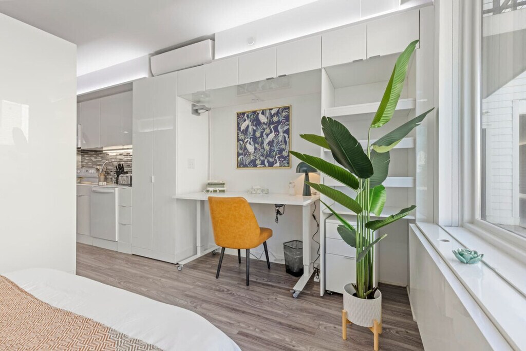 Feel at home in this sleek, open-concept studio on the first floor, placing you minutes from University Circle, Cleveland Clinic, top museums, Little Italy, Downtown, stadiums and major attractions, perfect for work, medical visits, or leisure stays. This apartment features a fully stocked kitchen with a coffee maker and kettle, olive oil, salt, pepper, sugar, pots, pans, utensils, toaster, and microwave. The bathroom includes shampoo, conditioner, body wash, and a hair dryer. Cleaning supplies such as laundry detergent and dish soap are provided. Enjoy a 50" smart TV with streaming, fast, reliable Wi-Fi, air conditioning, room-darkening shades, and access to a rooftop patio with city views. A washer and dryer are included in the unit. Free private parking is available on-site in spot #27. You'll be just 8 minutes from University Circle and Cleveland Clinic, 10 minutes from Little Italy, and 12 minutes from Downtown, Rocket Mortgage Field House, Progressive Field, and Browns Stadium. Explore Cleveland easily by bike, train, car, or bus. Quiet hours are from 10 PM to 8 AM. Smoking indoors is prohibited and will incur a $500 fine. No pets are allowed, and unregistered pets will incur a $500 fine. Unauthorized parties will result in a $1,000 fine and removal without a refund. Only registered guests are allowed, and undeclared guests will incur a $350 fine per night. A security camera is located outside the unit door and should not be covered or disabled, as doing so will incur a $500 fine. Check-out is by 10:00 AM, and a late fee of $50 per hour will be charged after 11 AM. Includes a dedicated workspace for remote work. [SI]