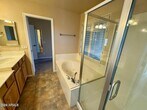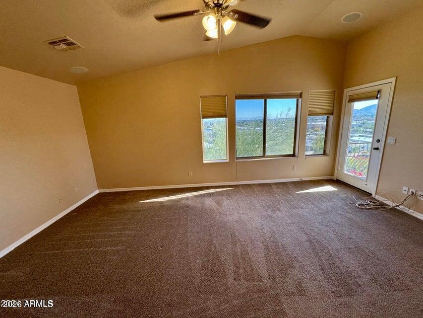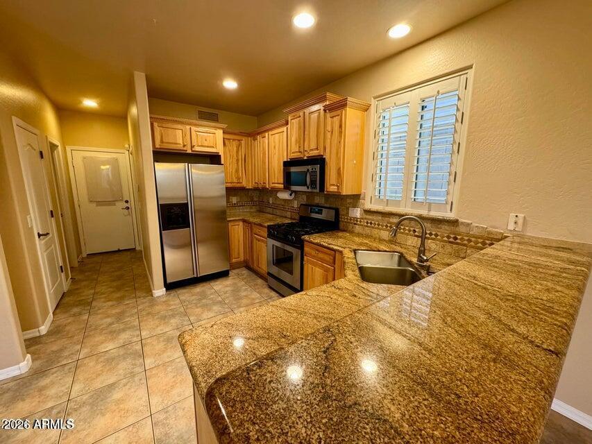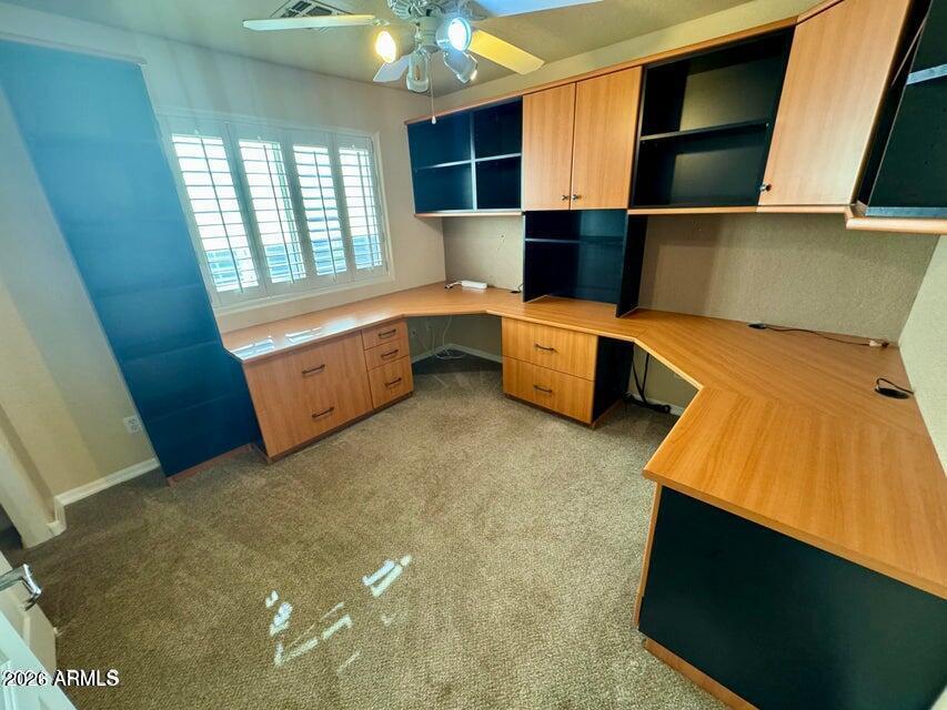 This beautiful home offers 2 bedrooms,2.5 bathrooms,plus a private office complete with built-in desk and cabinetry. The living room features soaring vaulted ceilings,creating a bright and open atmosphere. Upgrades abound,including a custom closet organizer in the primary suite,a spacious walk-in pantry with ample shelving,and built-in cabinets and a workbench in the garage,just to name a few. The guest bathroom stands out with a rough-cut stone vessel sink and custom paint details. The kitchen seamlessly flows into the family room and features stainless steel appliances,a breakfast bar,and continued scenic views. Step outside to enjoy a kiva fireplace by the pool,ideal for cooler evenings,and a generous balcony off the primary bedroom.