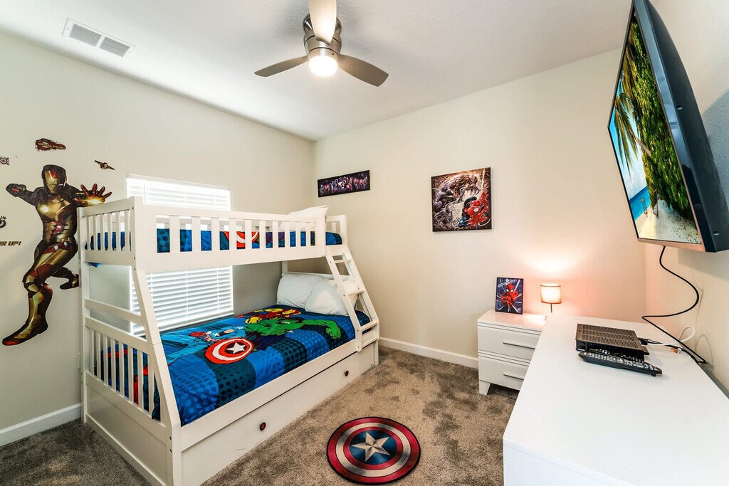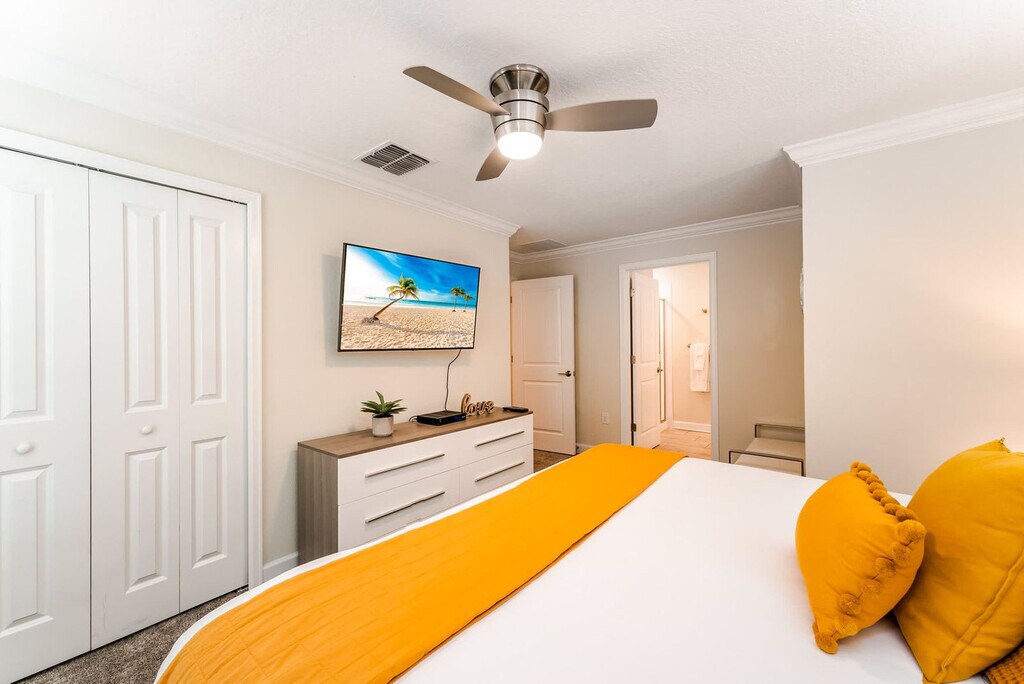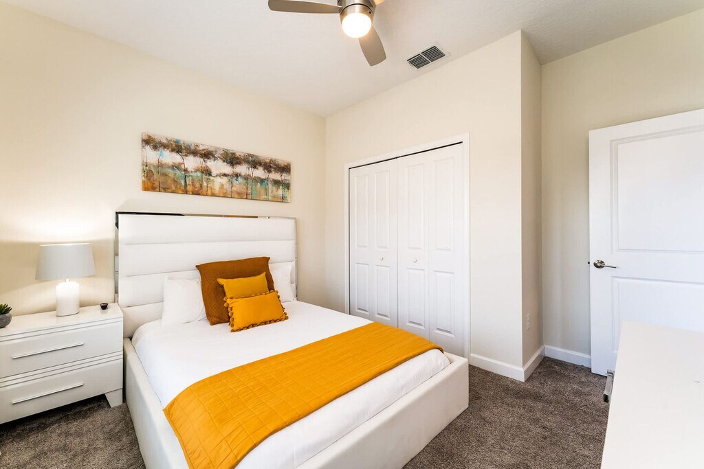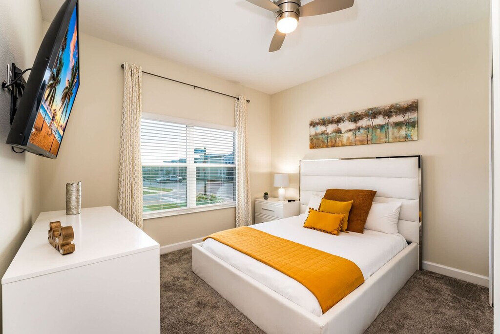 Escape to luxury and relaxation in this 5-bedroom townhome in Champions Gate. Feel at home in this stylish retreat, perfectly located for exploring Orlando's thrilling attractions, dining, and shopping. This amazing luxury townhome features two living room spaces, a dining area, and an equipped kitchen with a breakfast bar. It also includes a private screened pool with a covered lanai, four bathrooms, a washer and dryer, hairdryers, an iron, ironing board, and complimentary Wi-Fi. Sheets, towels, shampoo, conditioner, body soap, toilet paper, and initial kitchen supplies are provided. Pool heat is available for an additional fee of $45 per day, with a minimum of 2 days' notice required. This townhome is located in The Retreat at Champions Gate, a short-term rental approved neighborhood within Lennar's Champions Gate. The luxurious amenity center features The Grille Room restaurant and bar, a concierge desk, a movie theater, a fitness center, a game room, two temperature-controlled pools, a lazy river, a 2-story water slide, a children’s water play structure, sand volleyball, rentable cabanas, poolside food and drink service, the Tiki Bar, 7 tennis courts, and the Champions Gate Country Club golf course. Quiet hours are from 10:00 pm to 7:00 am. Guests must be 25+ years old unless accompanied by a responsible adult. No parties or events are allowed. Only registered guests may stay overnight; a list must be sent prior to check-in. Vehicles parked in violation of parking rules may be towed immediately. Charcoal grills are strictly prohibited due to fire hazards; using charcoal grills may result in a fine of up to $500 and eviction. Pets are welcome with a fee of $150 per pet per stay; weight restrictions apply. For stays of 20 nights or longer, a mid-stay cleaning will be scheduled every two weeks to maintain comfort and quality. [SI]