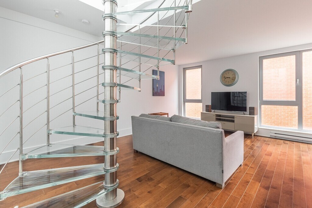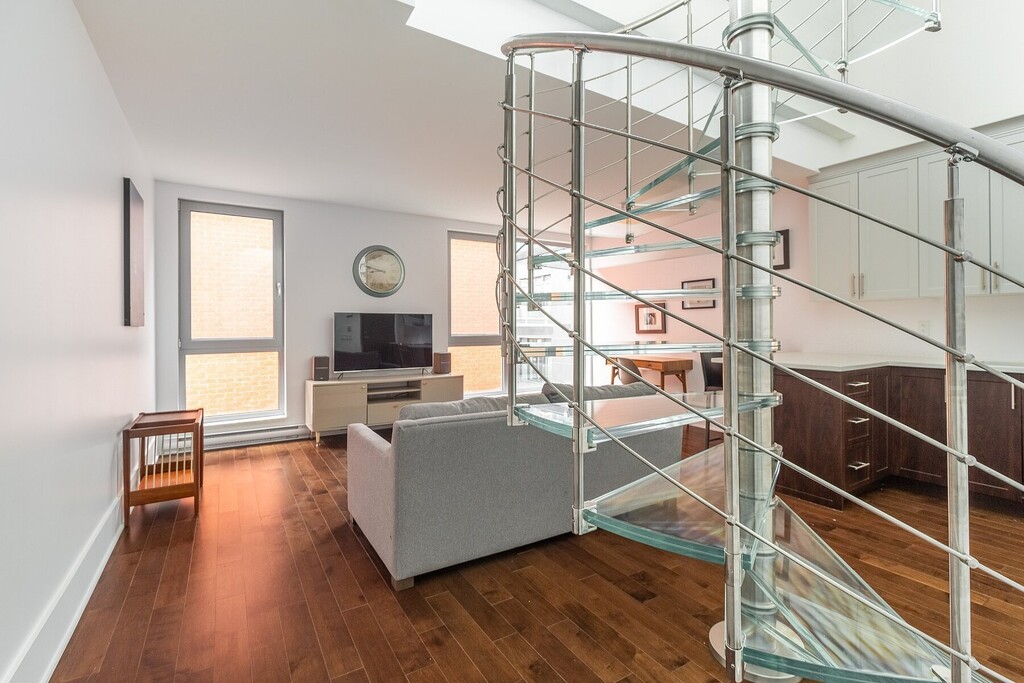 Two-storey New-York style loft. Modern & open-concept with tempered glass spiral staircase. This incredibly bright unit was almost totally rebuilt in 2021. Private rooftop terrace, high-end appliances, quartz counter top with breakfast bar, central location in the Village and a stone's throw from downtown!