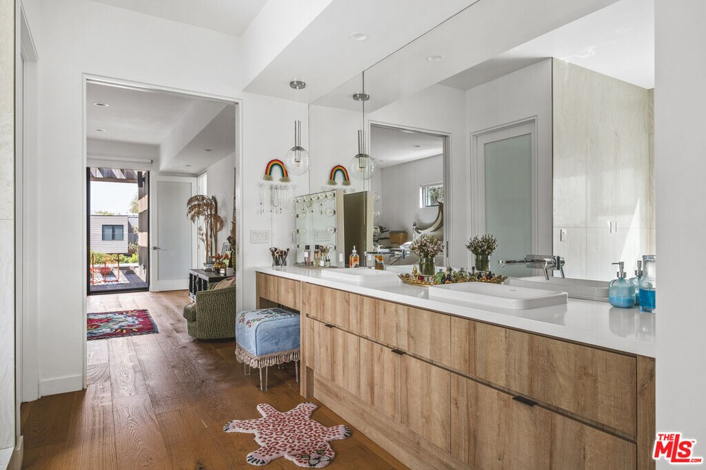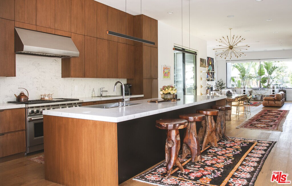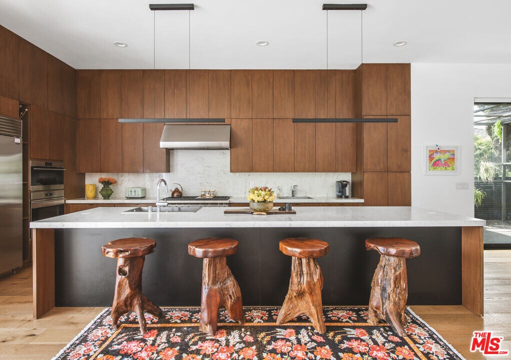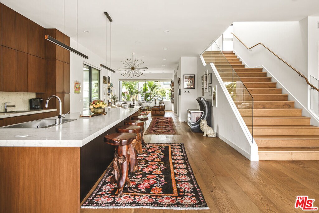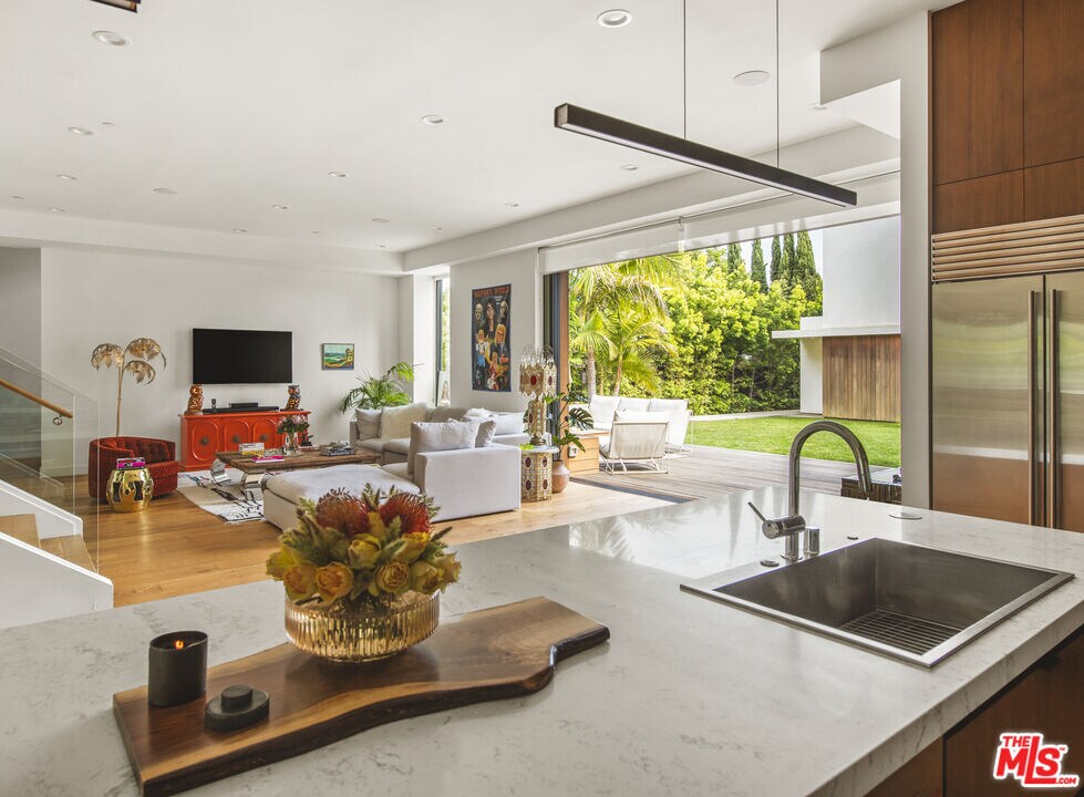 Discover an architectural gem with treetop and ocean glimpses, plus breathtaking sunsets. Created by OTT Arch, this unique contemporary home offers an open layout filled with light, promoting the sought-after Southern California indoor/outdoor living while ensuring privacy in Mar Vista. It features 7 beds, 8 baths, including 3 upstairs bedrooms each with private outdoor areas, and expansive 10' pocket doors blending inside and outside seamlessly. The kitchen highlights a 14' island, quartz countertops, and high-end appliances, complemented by built-in wine storage. A striking staircase with glass rails leads to impressive amenities like light wood floors, a security system with video cameras, and room speakers. The rooftop deck offers 360-degree views, a fire pit, and a projector for outdoor movie nights. The lush backyard boasts a 40' pool, spa, built-in BBQ, and an ADU with 2 beds, 1.75 baths, full kitchen, and laundry, totaling nearly 1,100 sqft. A must-see home. Available furnished at a higher lease price per month. MLS# 26662661