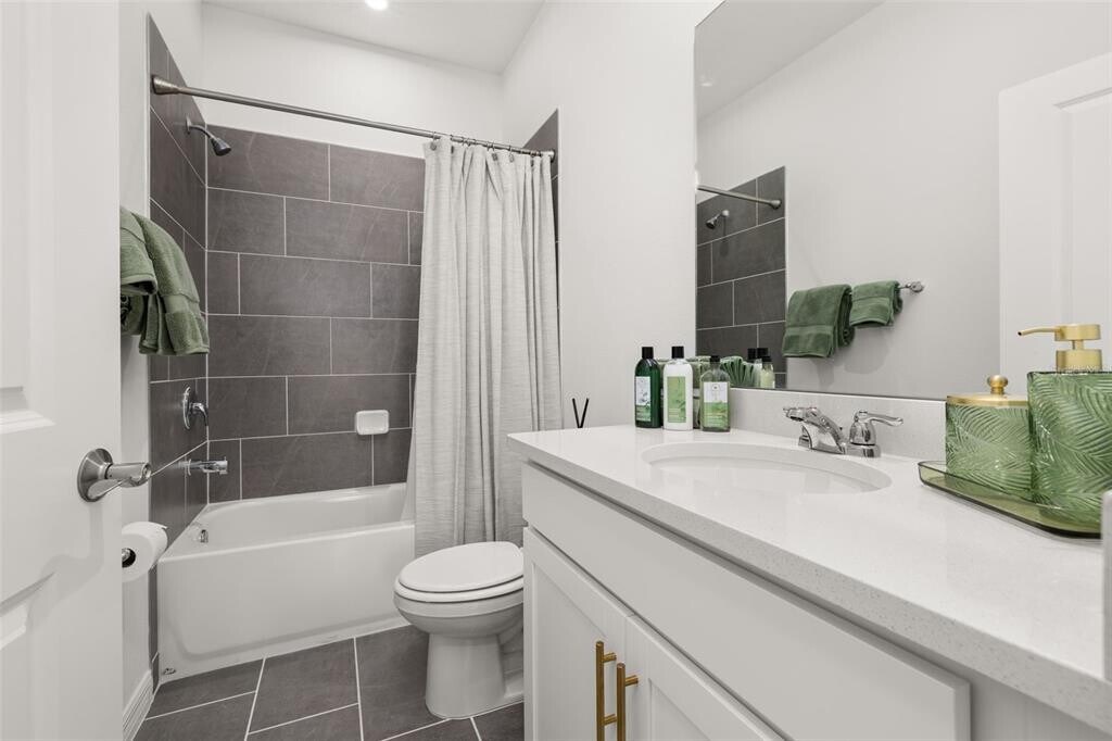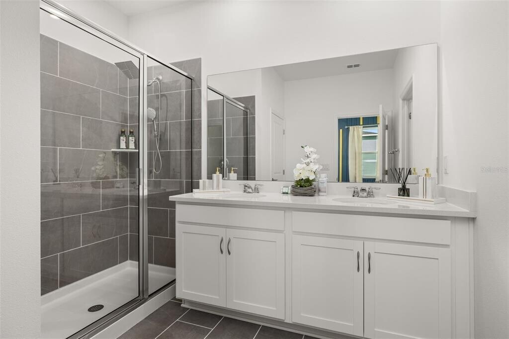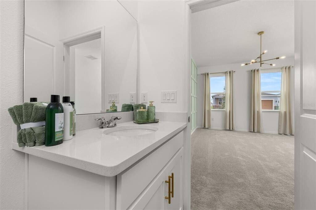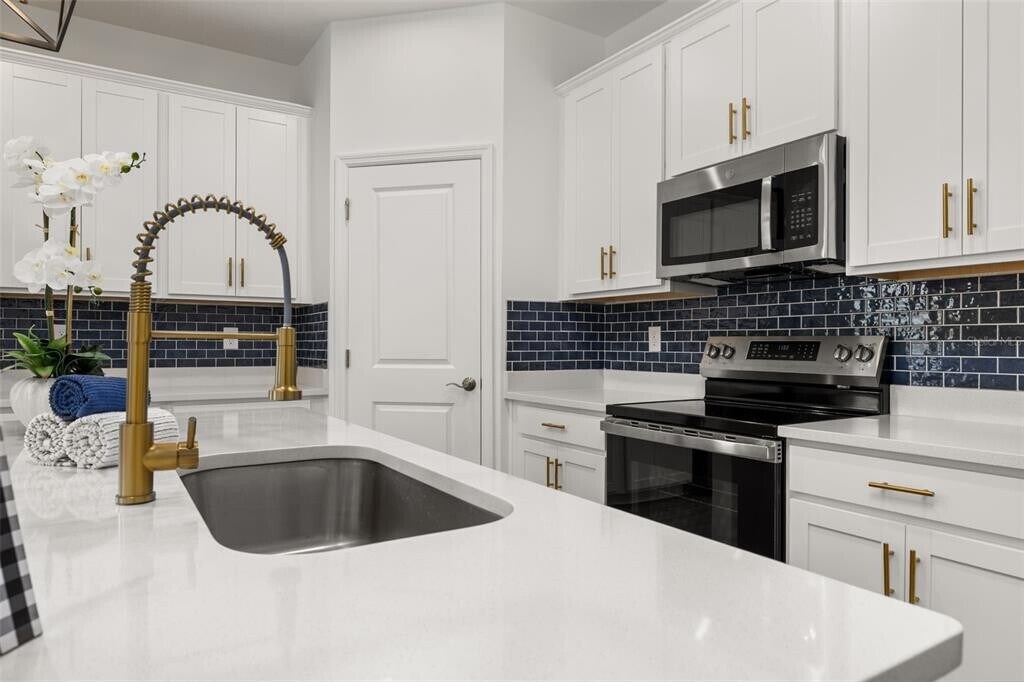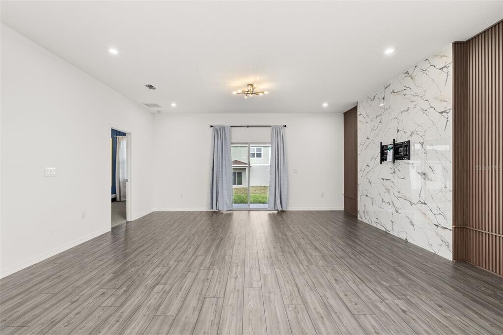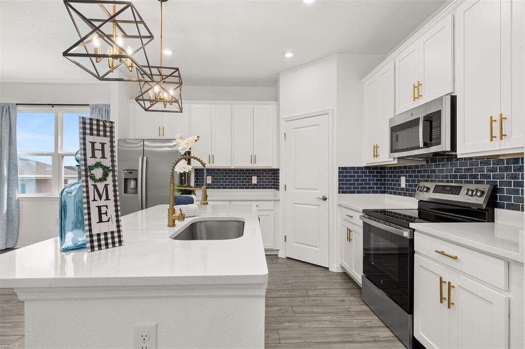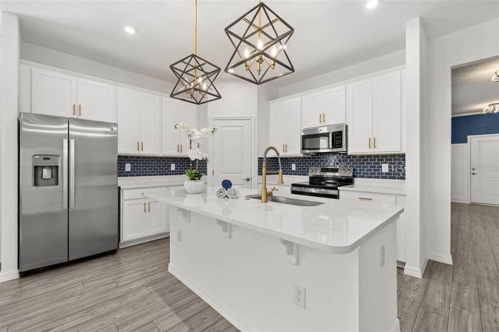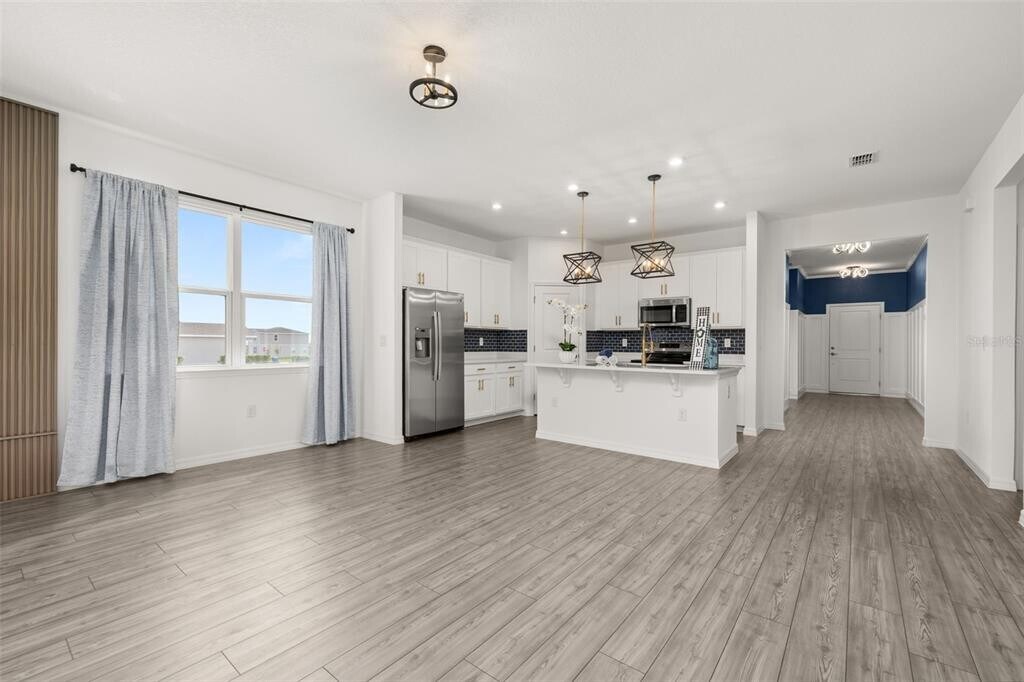 For Rent this beautiful brand new,never lived in Home with 4 bedrooms and 3 full baths. As soon as you walk in,find a long hall with decorative wainscoting wall panels. To the right find a junior master bedroom with a board and batten panel wall,walk in closet and a full bathroom with quartz countertop. Entering the open floor plan; The kitchen is open and airy and features stainless steel appliances and blue backsplash. A large island compliments the space for meal preps and entertainment. The living room is ample and features vinyl plank flooring throughout all the wet areas and a ceramic TV wall with an installed bracket that can hold up to a 100in TV. Sides decorative slat wood paneling. A covered patio to relax in the afternoons can be accessed from the living room. Generously sized primary suite with a unique paneling in navy blue and gold. Large wall in closet. The primary bathroom has a linen closet,dual sinks and an enclosed shower with a rain shower head. Laundry room with installed shelving for your detergents and clothes organization. Three additional bedrooms with a third bathroom make it ideal for growing families,all with board and batten pattern and different colors to go with your decor. This home has it all! The landlord thought about every idea possible,including a water softener,decorative curtains,gutters,and a copper lightning rod to protect your family. Located minutes from Lake Eva Park and Ben W. Graham Park,the community offers a pool cabana,dog park,gazebo,walking paths and a playground. There is an additional charge of $10/month for high quality AC filters MLS# S5136342