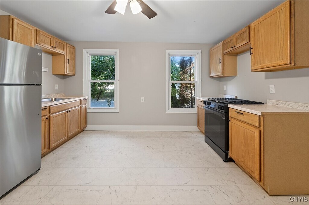 Welcome to this fully updated 3 bedroom,1 bathroom ranch single family home ready to rent today! Located on a quiet,dead end street with plenty of parking space. Enter through the fully enclosed front porch to find a spacious,bright living room,formal dining room,and three bedrooms. The kitchen is fully updated with new appliances,flooring and cabinets. The large full bathroom is also fully updated. New washer and dryer are located on the main level off the kitchen. This home has been fully updated with fresh paint and flooring throughout as well. Rent includes water and trash/recycling. First month and security deposit due with lease and keys. Pets allowed with permission. Conveniently located near main highways,restaurants,and shopping.