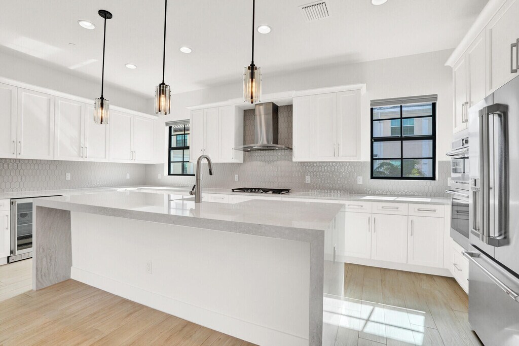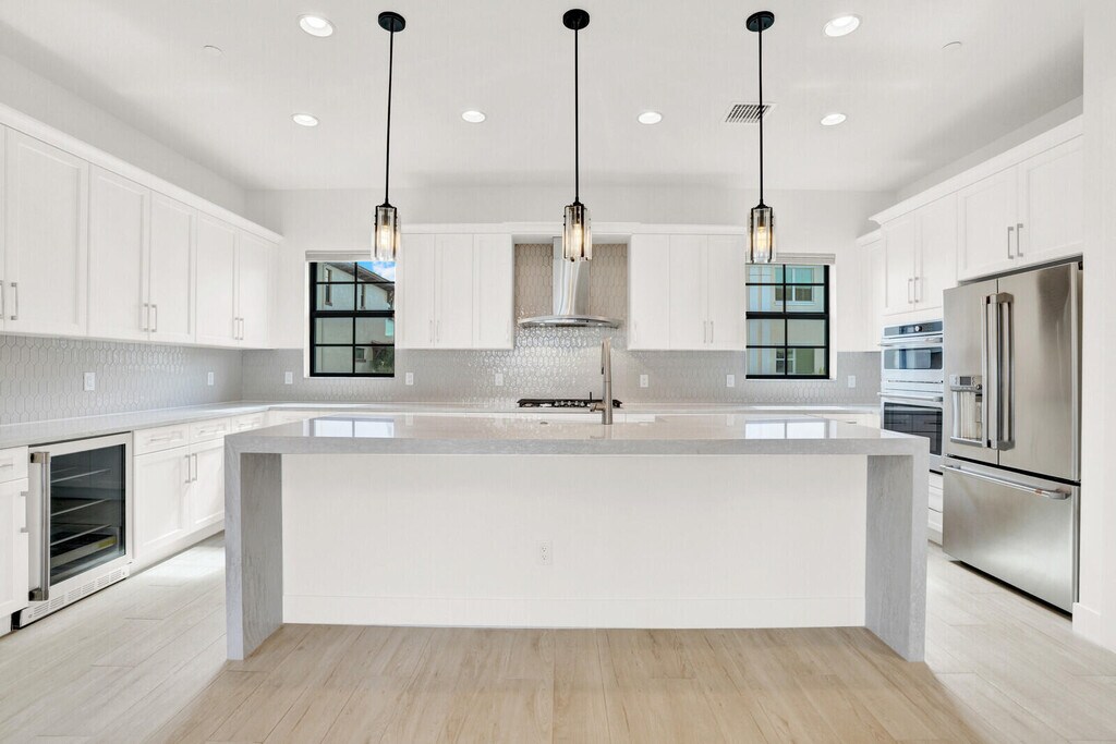 Welcome home to this fabulous lakefront CORNER UNIT serenity! This stunning filled with bright natural light 2023 CBS 3-bedroom PLUS den, 3.1-bathroom home with a spacious 2-car garage offers beautiful and peaceful lake views you'll fall in love with every day. Step inside to discover elegant wood-look tile floors, a den, full bath & storage on main floor. Climb up to the 2nd floor unto the main living area to find breathtaking waterfall quartz countertops, sleek modern SS appliances (including a gas stove & wine fridge) a walk-in pantry, extended cabinetry and energy-efficient design throughout, style and sustainability in perfect harmony. On the 3rd floor you have the convenient laundry room, the main bedroom with large walk in
