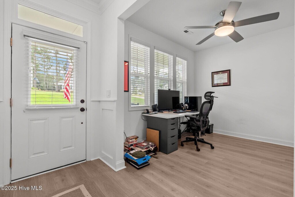 Available September 1, 2025, this spacious 5-bedroom, 2.5-bath home in the sought-after Legacy Lakes neighborhood offers the perfect combination of comfort, style, and community amenities. The open, modern floor plan features luxury vinyl plank flooring throughout the main living areas, a gourmet kitchen with quartz countertops, stainless steel appliances, a large island, and contemporary fixtures. Sunlight pours into the living and dining spaces, while two versatile rooms on the main level provide options for a formal dining area, home office, or additional lounge. Upstairs you'll find four bedrooms including a spacious primary suite, with the newly completed fifth bedroom occupying the private third floor, ideal for guests, a playroom, or a quiet retreat. An attached garage provides ample space for parking, storage, a home gym, or a workshop. Outdoor living is made easy with a covered front porch, a covered rear patio, and a backyard perfect for pets, play, and gatherings. Legacy Lakes residents enjoy access to a resort-style pool, tennis courts, pickle ball courts, playground, clubhouse, and fitness center, and the location offers convenient access to Pinehurst, Raleigh, Fort Bragg, and Camp Mackall. Additional features include a gas fireplace, wainscoting, blinds, and light-filled interiors. The only thing this home needs is you.