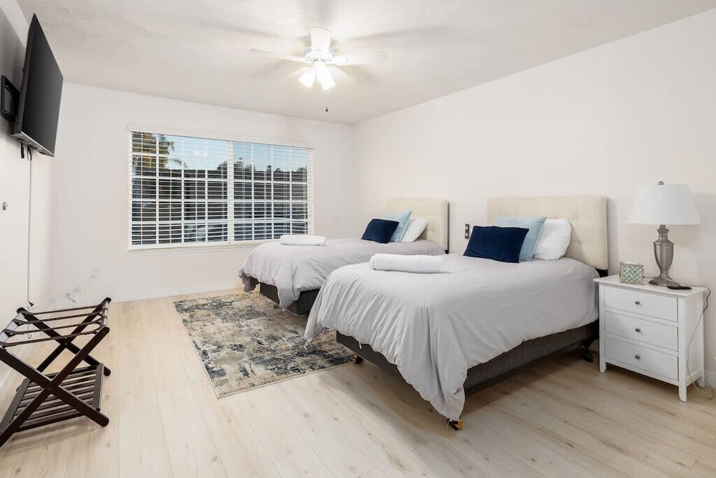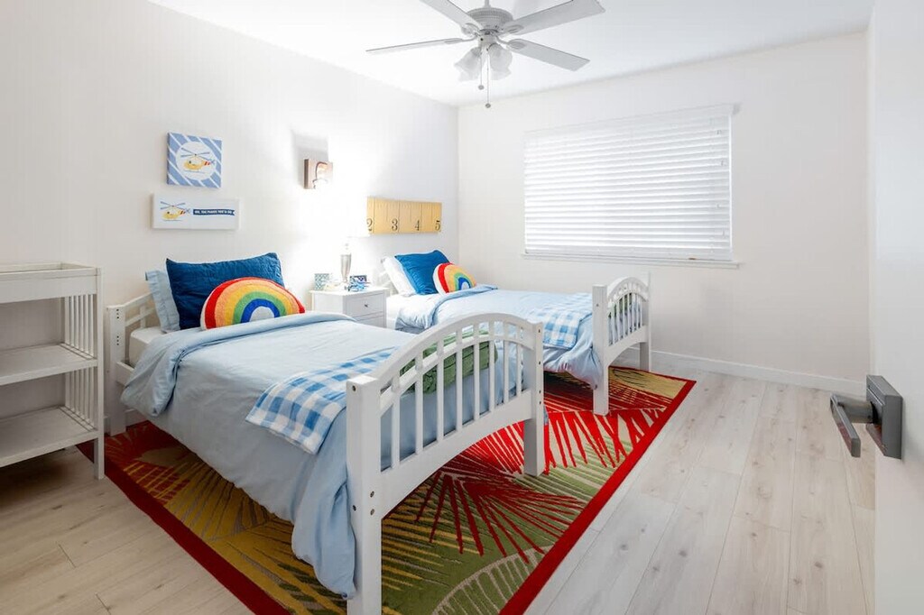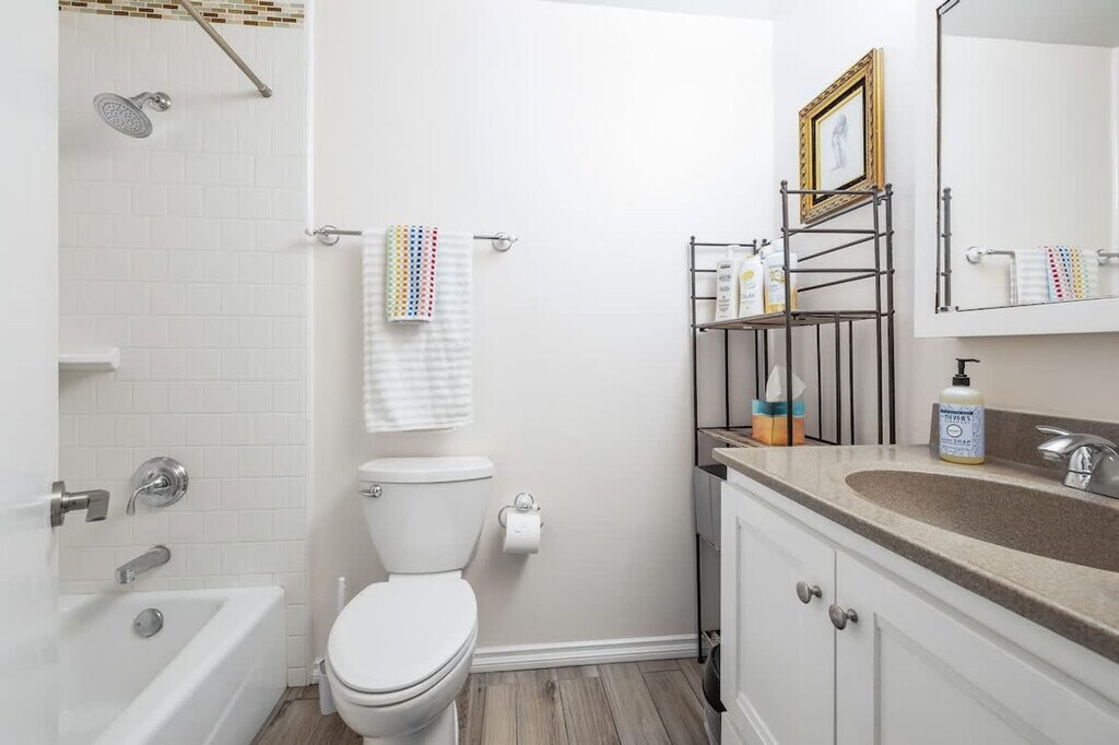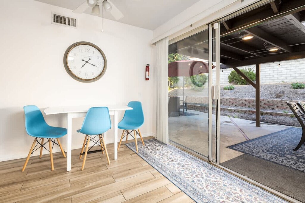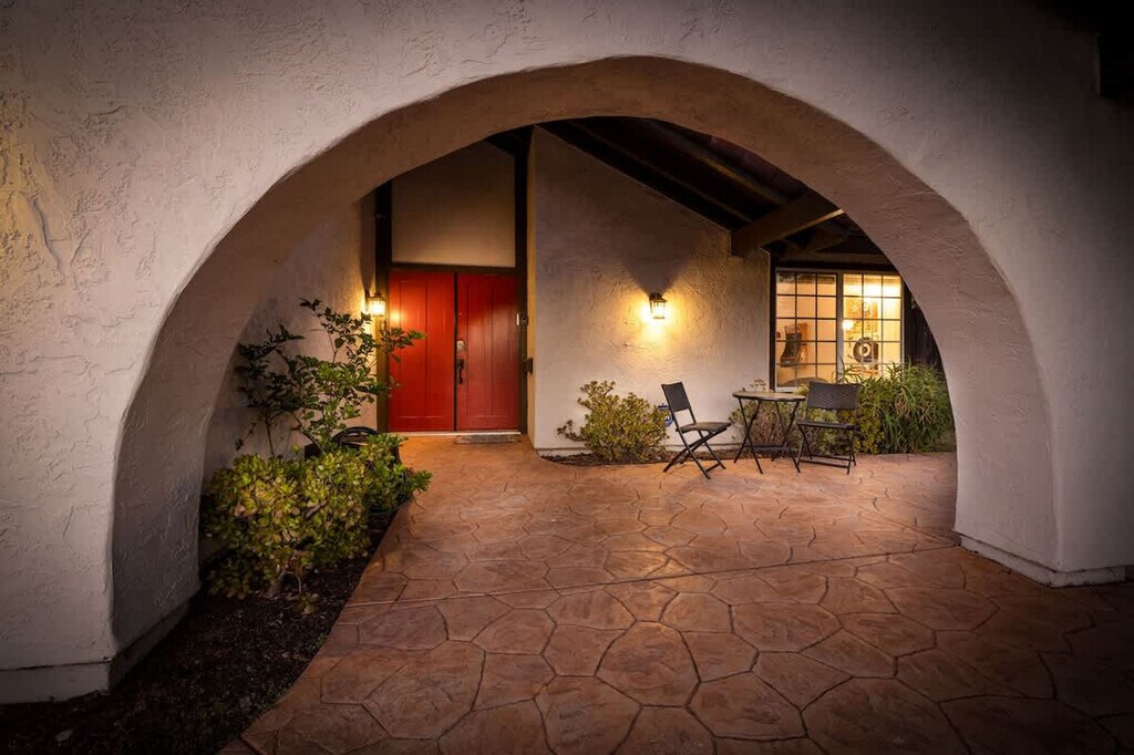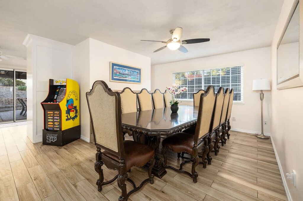 Feel at home in this spacious 5-bedroom home located in a quiet cul-de-sac in Poway/Rancho Bernardo, San Diego. With three bathrooms, this home is perfect for families or groups of friends. This home features an amazing living room with a vaulted ceiling, a massive new couch, and a 75' TV. The fully equipped kitchen includes brand new appliances and a whole home water filtration system. Enjoy the NBA arcade game, Pac-Man arcade, indoor and outdoor fireplaces, and a large backyard with patio furniture, a barbecue, and an outdoor TV. A coffee machine and coffee are provided. The backyard is fully fenced, making it perfect for kids and pets. On-site free parking is available. A Graco 'Pack 'N Play' and kids' toys are provided. Tucked away in a peaceful, safe neighborhood, this home is just a stone's throw from amazing golf courses and picturesque vineyards. It's the ultimate spot to unwind after a day of adventures. This home is very family friendly. [SI]