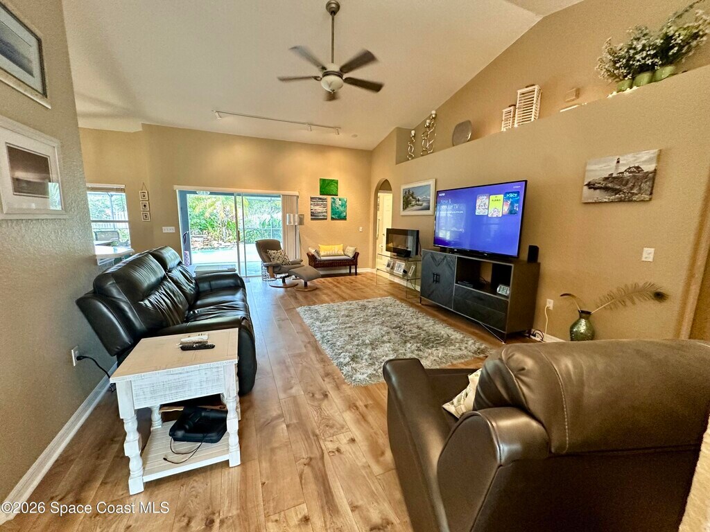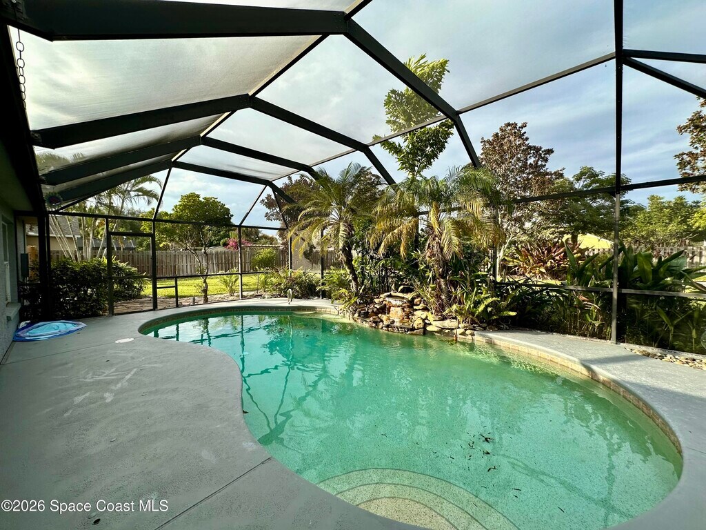 Welcome to this well-maintained home nestled in a quaint residential South Merritt Island community. Enjoy convenient access to major employers including Blue Origin,SpaceX,NASA,L3Harris,and Patrick Space Force Base. This split floor plan home (4BR/3BA) is designed for modern living with vaulted ceilings,a gas cooktop,and zero carpet (Tile & Pergo laminate throughout) and indoor laundry room with washer/dryer included. Step outside to your private oasis featuring a screened pool and large fenced backyardand added BONUS: Pool and Lawn service are included! When it's time to unwind,you are less than 15 minutes from the world-famous Cocoa Beach/Port Canaveral Cruise Port and less than an hour to Orland/Disney. Added bonus: side yard has a parking area for a boat/trailer or small camping trailer (landlord approval required). Don't miss this great opportunity to live in paradise! MLS # 1066818