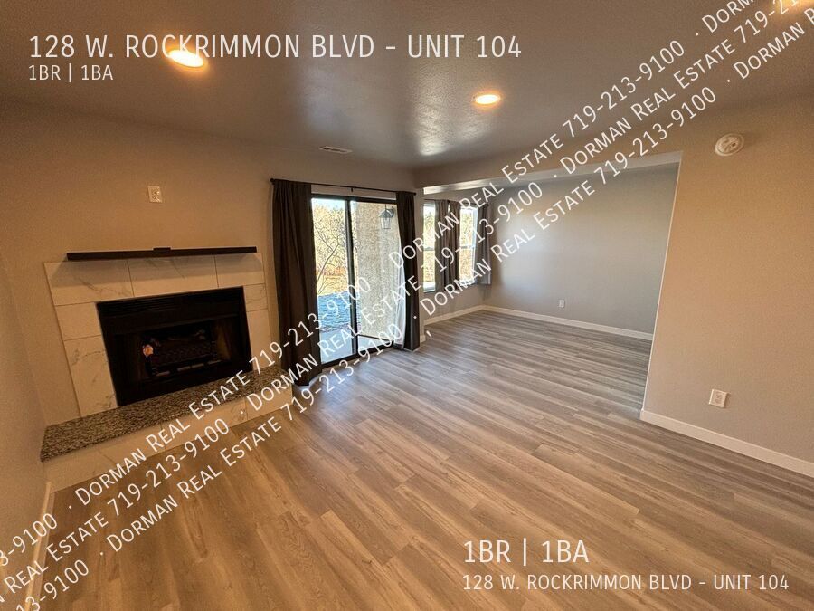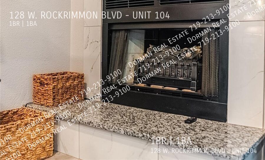 Beautifully updated studio condo in Rockrimmon with walk out patio! Unit is 618 square feet, with an alcove that can be used as bedroom space. Includes stackable washer/dryer, large walk in closet, double vanity. Updated kitchen looks over living room with wood fireplace. Exterior storage closet for tenant use. Community includes pool and hot tub, gazebo with bbq grills. Assigned parking space. Small pets under 30 lbs permitted, HOA rule. Please check out our application handbook by copying and pasting the link below into your web browser