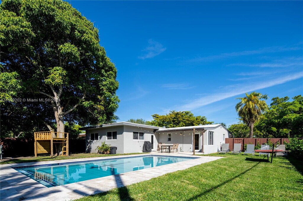 This beautiful and spacious Mid-Century Modern home is located on a quiet residential street in North Miami. The residence has 4 bedrooms, 2 bathrooms, a full kitchen, dining room, laundry and a large circular driveway that can accommodate up to 6 cars. An oversized back yard is fully fenced for privacy and hosts an outdoor patio, dining area and a newly build 15x30ft heated saltwater pool - constructed in 2021. A truly private and peaceful residence! Listing posted by Felix Santos [SYNDID 4080523 10052025]