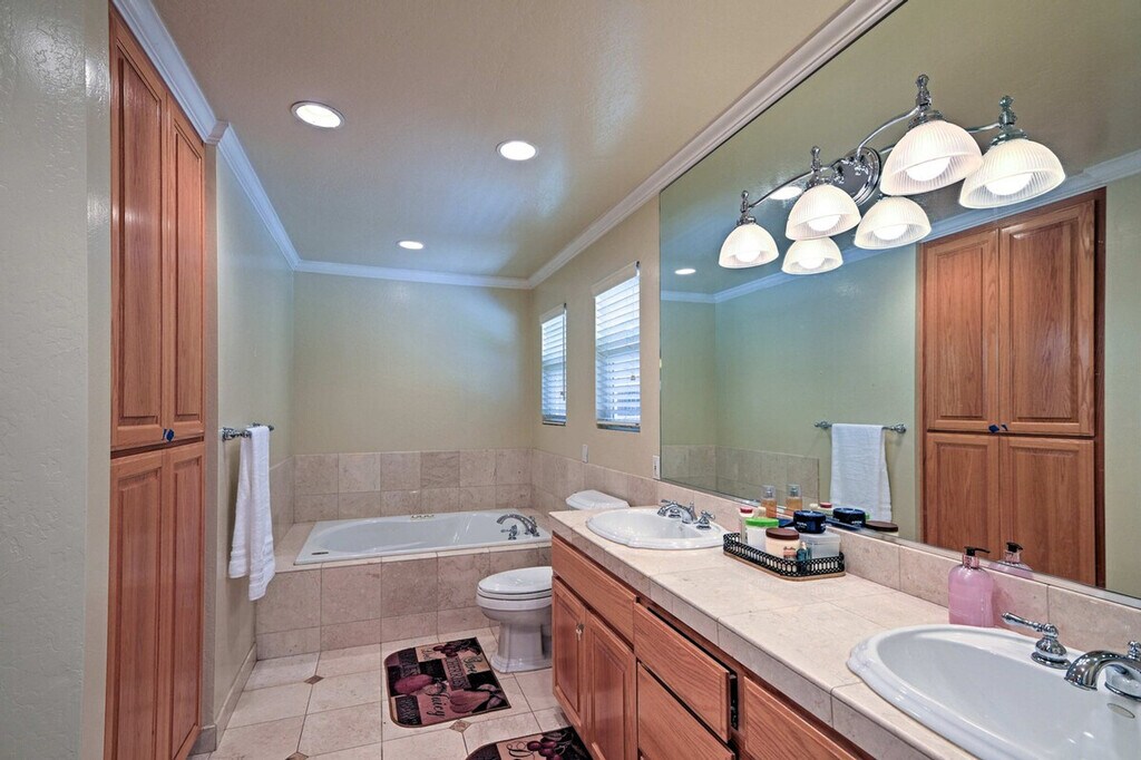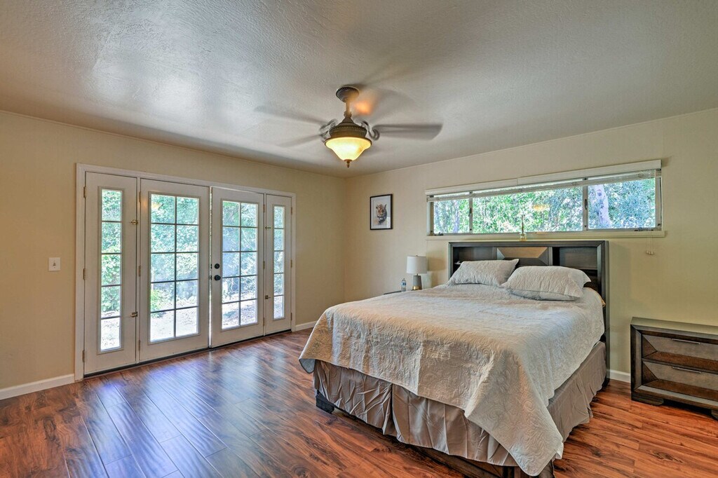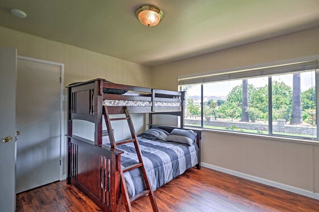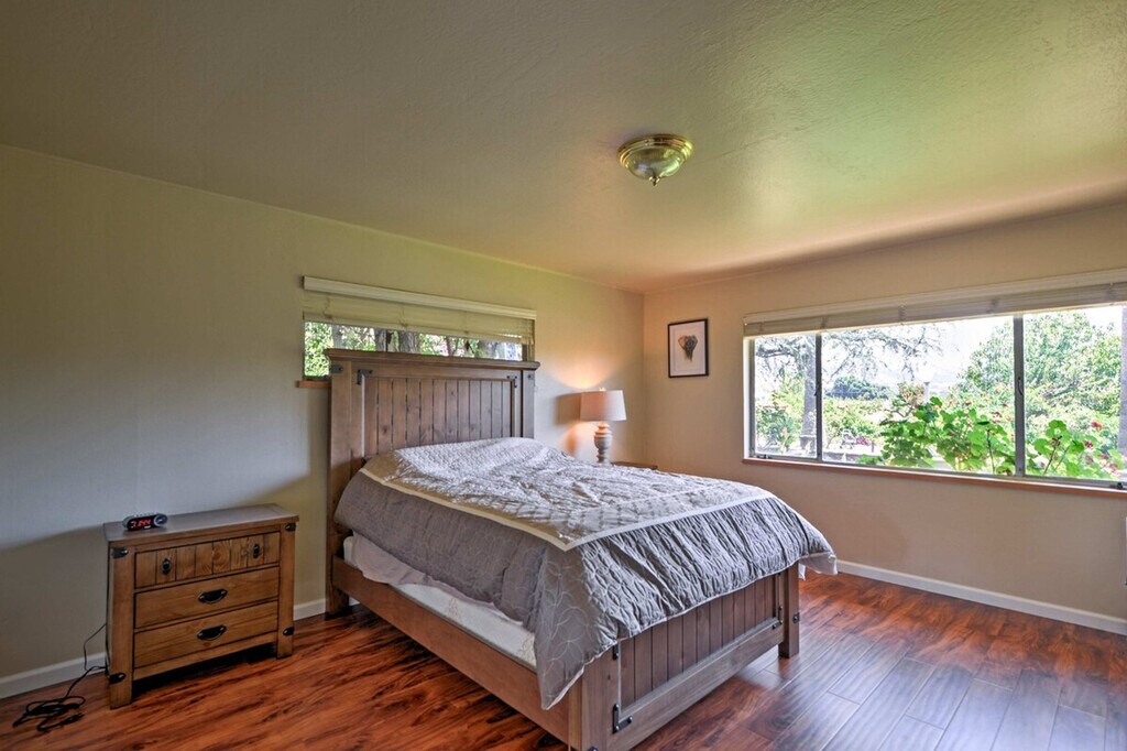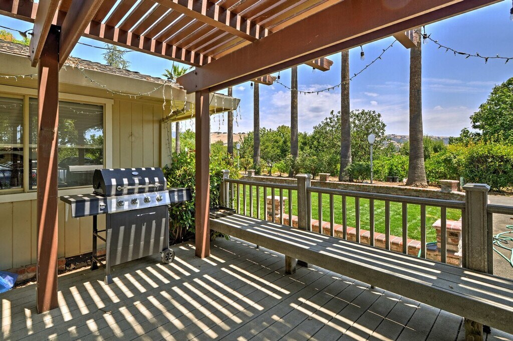 Plan a relaxing getaway with friends and family at this 3-bedroom, 3-bathroom vacation rental house in Gilroy. Set on 20 acres of land, this 2,500-square-foot home offers well-appointed accommodations and is close to downtown, boutique wineries, shopping, and more. You'll love being centrally located close to San Jose, Monterey, Santa Cruz, and San Francisco. The property requires 2 steps for access. Soaring palm trees welcome you to your new home-away-from-home. Kick back and relax on the plush furnishings in the living room, which features a wood-burning fireplace and a flat-screen TV. When you're ready to eat, step into the fully equipped kitchen with everything you need to whip up a tasty feast for the whole group. Keep the cook company at the 3-person breakfast bar before setting the dining room table for 8. The expansive patio is sure to be your favorite spot with ample bench seating, a gas grill, an outdoor table, and a pergola. This home is set on 20 acres of land and is close to downtown Gilroy, boutique wineries, and shopping. You'll love being centrally located close to San Jose, Monterey, Santa Cruz, and San Francisco, making it an ideal base for exploring the region. There is another vacation rental unit on the premises, and there may be other travelers present during your stay. The property does have cell phone service, but it may be spotty since it is located in a rural area. No smoking, no pets allowed, and absolutely no parties, events, or large gatherings of any kind are permitted. Guests must be at least 25 years old to book. Additional fees and taxes may apply, and a photo ID may be required upon check-in. [SI]