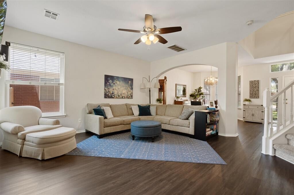A truly exquisite and meticulously maintained home nestled in the coveted and well-established community of Scofield Farms. Step inside to discover an open living concept with large windows, allowing abundant natural sunlight to shine through with shiny luxury vinyl flooring throughout the living areas. The updated kitchen features granite countertops, a stylish backsplash, SS appliances, and a 5-burner cooktop. Relax in front of the cozy living room fireplace or dine with guests in the formal dining room. This home has it all! As you make your way to the upper level, you will be greeted by the primary wing, which offers a sitting area and vaulted ceilings equipped with an en-suite bathroom featuring a double vanity, a walk-in shower, and a deep soaking jetted tub. Indulge in the three additional guest bedrooms; every room has a unique character that invites you to immerse yourself in comfort. Nestled amidst a canopy of shade, the large, fully fenced yard features an outdoor deck and pergola, where grilling with your friends or family can become a nightly ritual. Situated within walking distance of top-rated schools, and nearby public charter schools Valor and NYOS. Just a 10-minute drive away, you'll find the Domain shopping center and Q2, the FC soccer stadium, providing endless entertainment and shopping options. Close in proximity to major tech centers, including Apple, Samsung, and Dell. Enjoy access to a community pool and playground, perfect for relaxation and recreation. The 13-acre Scofield Farms Neighborhood Park is a haven for outdoor enthusiasts, featuring walking trails, picnic tables, a covered pavilion, a baseball field, a sand volleyball court, and vast green spaces, promising endless hours of enjoyment for all. Refrigerator, washer, and dryer convey and Google fiber is available! Home improvements include a recently replaced backyard fence, new roof, water heater, garage door, irrigation system, and so much more. MLS ID 3999086