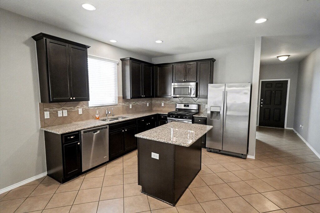 Discover this stunning 3-bedroom, 2-bathroom home nestled in the sought-after Alamo Ranch subdivision. Step through the impressive entryway and past a versatile flex room-perfect for a home office, study, or playroom-into the open-concept kitchen, dining, and living area. The kitchen is a true showpiece, featuring granite countertops, a stylish tiled backsplash, upgraded cabinetry, and a large center island ideal for meal prep and entertaining. Matching stainless steel appliances, including a refrigerator, convey for added convenience. The spacious primary suite is thoughtfully separated from the secondary bedrooms, offering enhanced privacy. It includes a luxurious en-suite bath with dual vanities and an extended walk-in shower. Both secondary bedrooms are generously sized and feature ceiling fans for year-round comfort. Outside, enjoy a charming and private backyard complete with a covered patio-perfect for morning coffee or evening relaxation-surrounded by mature trees. A separate storage shed provides ample room for all your extra belongings. Ideally located near top-rated schools, shopping, dining, and entertainment, this home also offers quick access to Loop 1604 and Highway 151. A true pleasure to show!