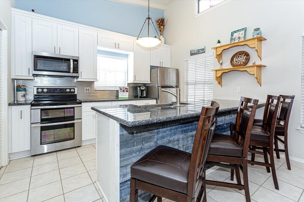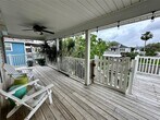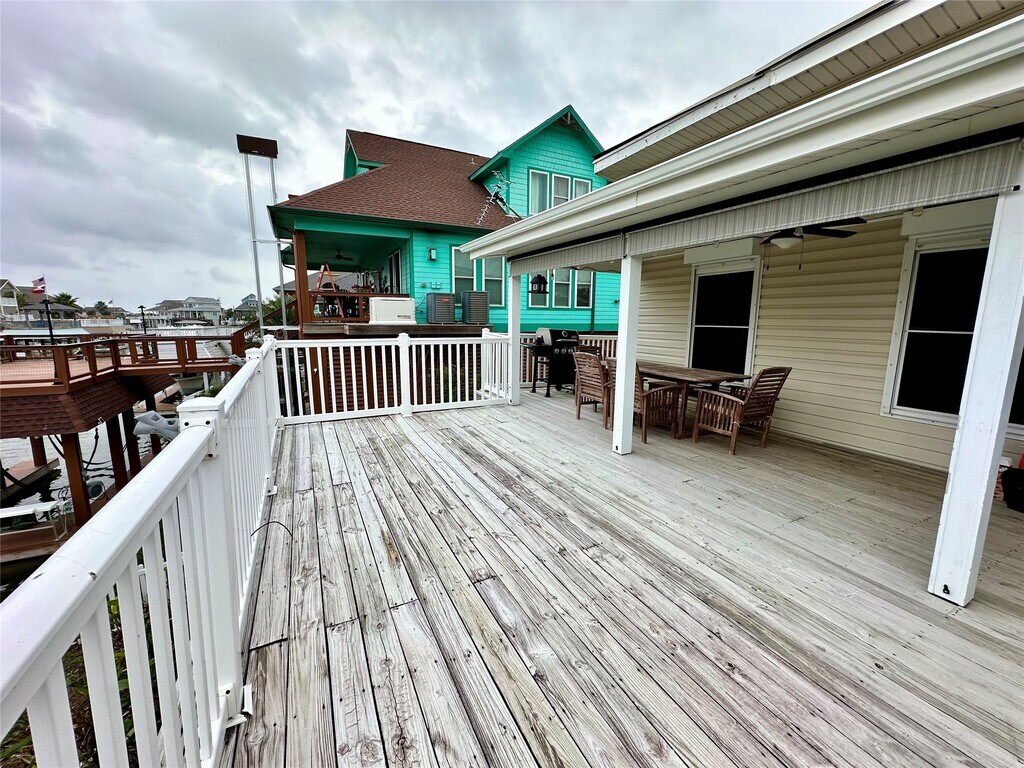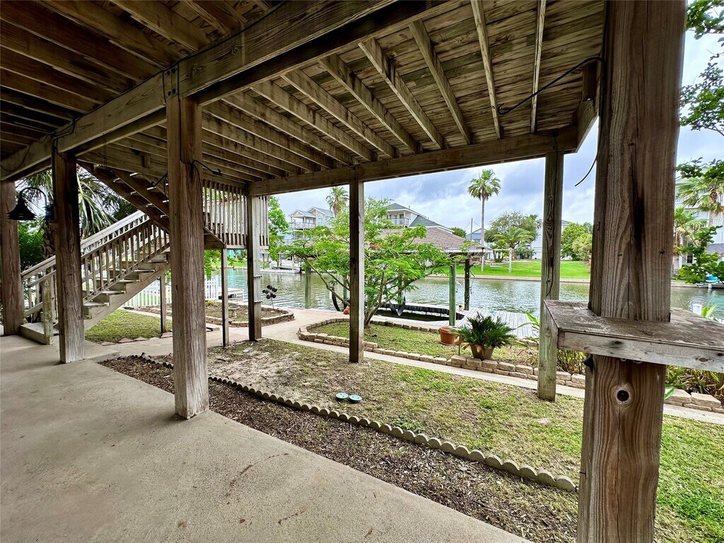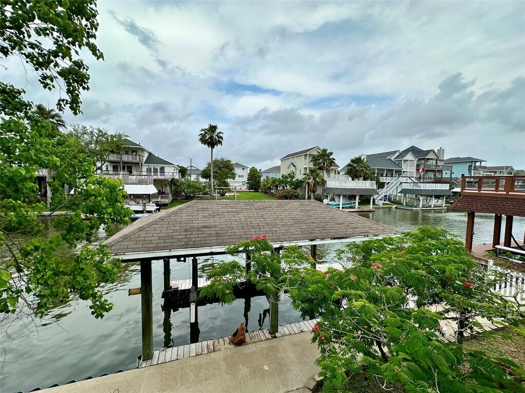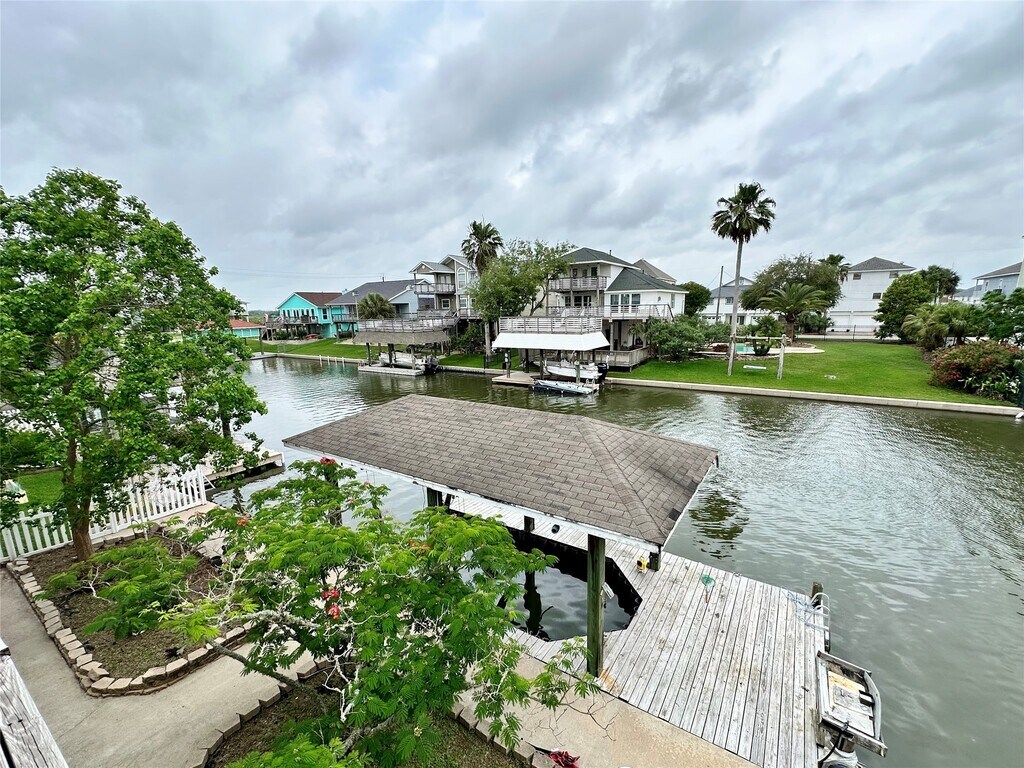 Waterfront GEM in Spanish Grant Bayside located ON THE CANAL! Enjoy gorgeous sunsets from this breezy back porch! Just a golf cart ride away from having toes in the sand on Galveston BEACH! Contemporary home with open concept kitchen & living,laundry,2 spacious bedrooms & shared bathroom completes the layout of the main home. The remodeled modern kitchen (2019) features an over-sized granite island,double ovens & stainless appliances. The 3rd bedroom (bunk room on ground level only) features a private full bathroom with shower for guests to visit in comfort. Storage on the left & workshop under the front patio. HUGE covered porch on ground level continues upstairs to the main entrance with great views of the canal & boat access to the bay. Boathouse with lift (new belts 2023),storm shutters,sprinkler system,& much more. Stays quiet as short term rentals not allowed. Furnished & vacation ready; simply pack your bags & let's go! MLS# 84712849