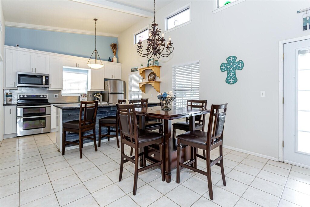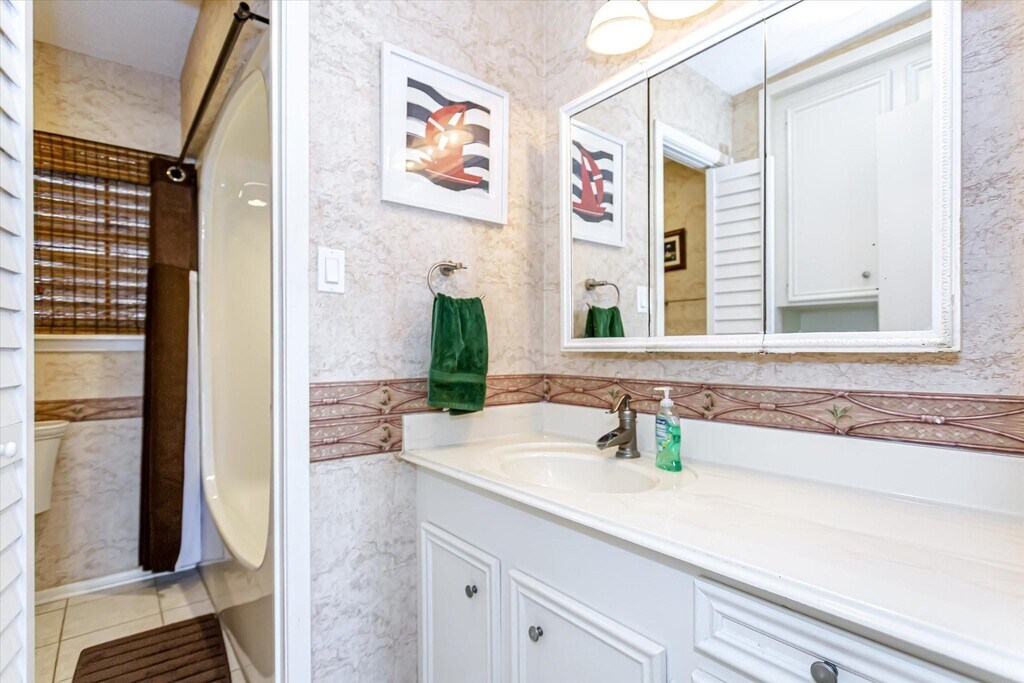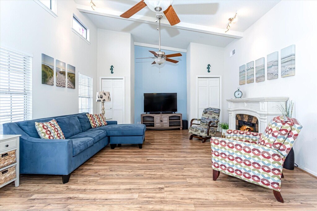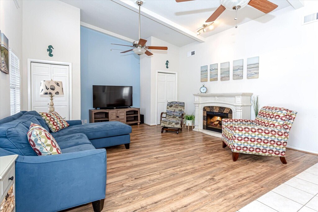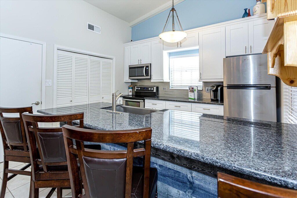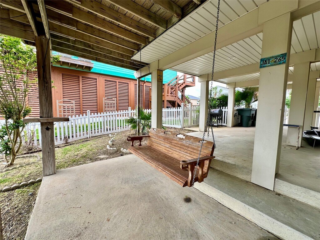 Waterfront GEM in Spanish Grant Bayside located ON THE CANAL! Enjoy gorgeous sunsets from this breezy back porch! Just a golf cart ride away from having toes in the sand on Galveston BEACH! Contemporary home with open concept kitchen & living,laundry,2 spacious bedrooms & shared bathroom completes the layout of the main home. The remodeled modern kitchen (2019) features an over-sized granite island,double ovens & stainless appliances. The 3rd bedroom (bunk room on ground level only) features a private full bathroom with shower for guests to visit in comfort. Storage on the left & workshop under the front patio. HUGE covered porch on ground level continues upstairs to the main entrance with great views of the canal & boat access to the bay. Boathouse with lift (new belts 2023),storm shutters,sprinkler system,& much more. Stays quiet as short term rentals not allowed. Furnished & vacation ready; simply pack your bags & let's go! MLS# 84712849