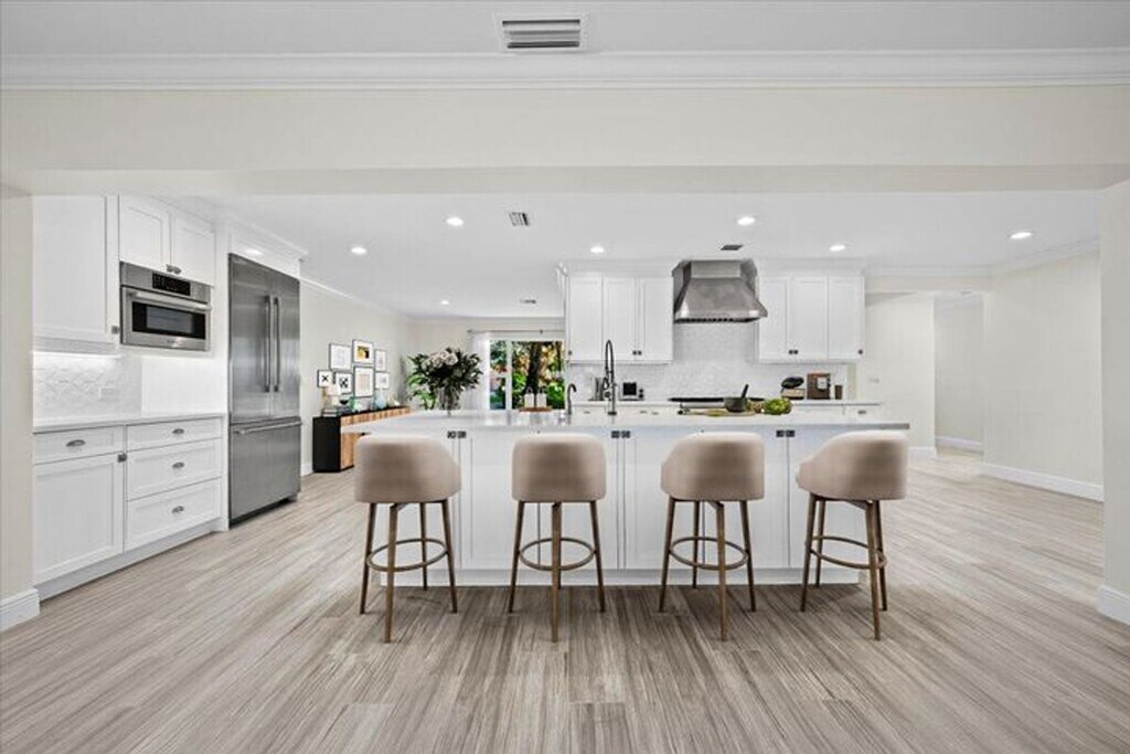 Courtesy of Illustrated Properties LLC (Jupiter) Posted by Andrew Coleman with EXP Realty . Available annually unfurnished or seasonally furnished. Live the salt life in this beautifully appointed 4-bedroom, 3.5-bath waterfront home with everything you need for the ultimate coastal lifestyle. Boaters will love the private dock with 80 feet of water frontage, direct Intracoastal and ocean access, and a covered 18,000 lb boat lift—no more storage fees! With no HOA, you'll enjoy true freedom and flexibility. This single-story home features an open floor plan with a sleek, high-end kitchen offering ample counter space—perfect for cooking, entertaining, or simply enjoying the canal view. Step outside to a spacious screened-in patio and your very own authentic tiki hut with a built-in bar—ideal for relaxing or hosting guests.