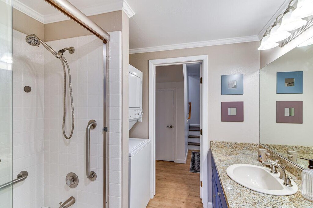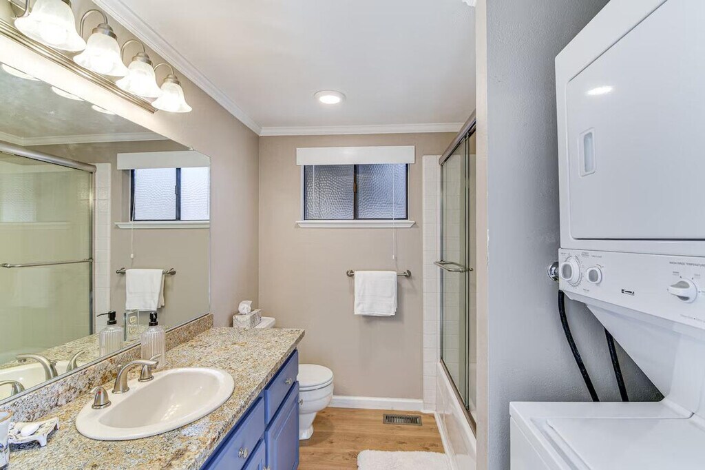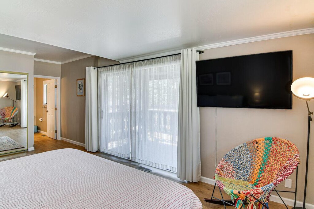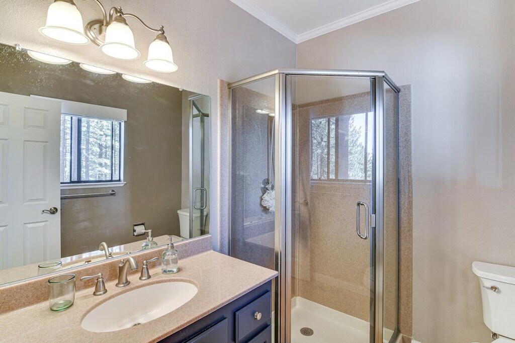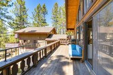 Escape to the mountains and feel at home in this charming 3-bedroom cabin in South Lake Tahoe, nestled in a serene forest neighborhood with peekaboo lake views. This 2-story cabin requires 2 small steps to enter, and interior stairs are required to access the bedrooms and full bathrooms on the lower level. This cabin features free Wi-Fi, in-unit laundry, and community amenities, including an outdoor pool and hot tub. The kitchen is equipped with stainless steel appliances, cooking basics, dishware and flatware, a Hamilton Beach Flexbrew pod coffee maker, a 12-cup carafe/drip coffee maker, an espresso maker, refrigerator, microwave, stove/oven, and dishwasher. Enjoy the HD projector with screen, dining table, breakfast bar, sunken living room with fireplace, laptop-friendly workspaces, a private balcony with forest views, patio furniture, and a Weber gas grill with propane provided. Linens, towels, and complimentary toiletries are provided, along with 2 window a/c units, central heating, and clothes hangers. Located in a rural area, the property may have spotty cell service. Four-wheel drive, all-wheel drive, or chains are recommended in the winter months to access the property. Bears and local wildlife are present in the area and around the property; food and trash should not be left outdoors. Quiet hours are observed from 10:00 PM to 8:00 AM. No smoking, pets, events, parties, or large gatherings are allowed. Area rangers strictly enforce all vacation rental ordinances (parking, noise violations, camping, etc). If a citation is received, the guest will be responsible for paying both guest and owner citations, up to $2,000. To avoid citations, follow all community rules as outlined in the Welcome Book and observe quiet hours between 10:00 PM and 8:00 AM. Outdoor hot tub usage is restricted during quiet hours and will incur a fine if used between 10:00 PM and 8:00 AM. You must only park in designated spaces (garage, paved driveway, carport, or parking lot). Vehicles are not allowed to park on the street. Camping on the property is not allowed. [SI]