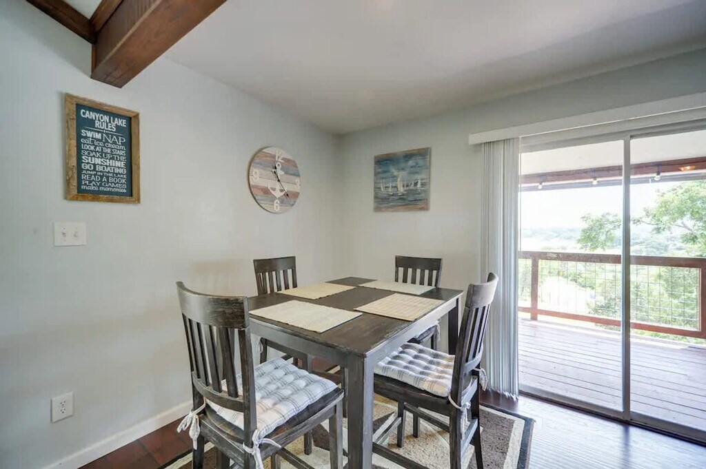 Feel at home in this 3-bedroom home encompassed by lush greenery and offering easy access to the sparkling waters of Canyon Lake. This vacation rental, 'Canyon Springs Cove', perfectly balances serenity and peace with excitement and fun. This home features an open floor plan, a gas grill, and a spacious deck with panoramic views of the surrounding area. A vehicle is recommended to get around the city. Located in a quiet neighborhood with a lot of wildlife. Quiet hours are between 10 PM and 8 AM. Use amenities at your own risk. Please be respectful of the neighbors. Registration Number: L1813 [SI]