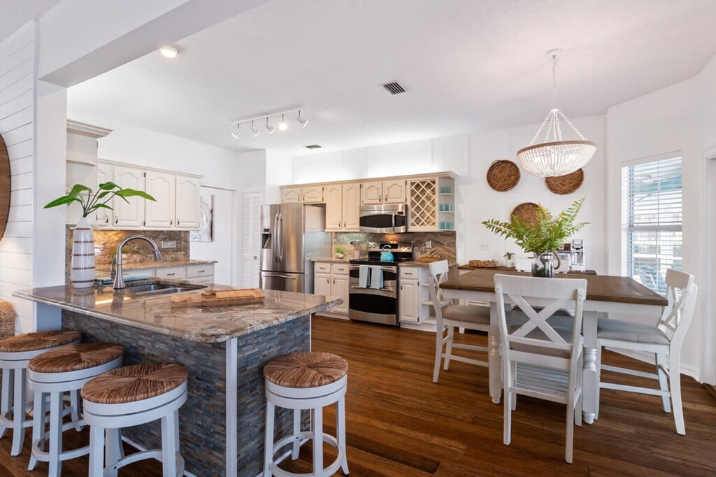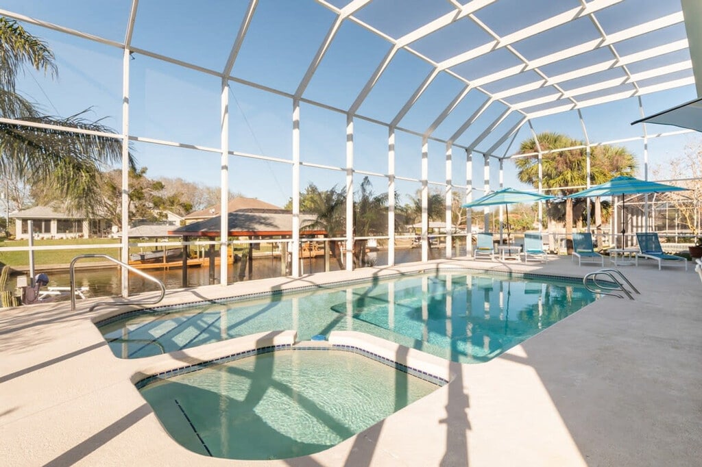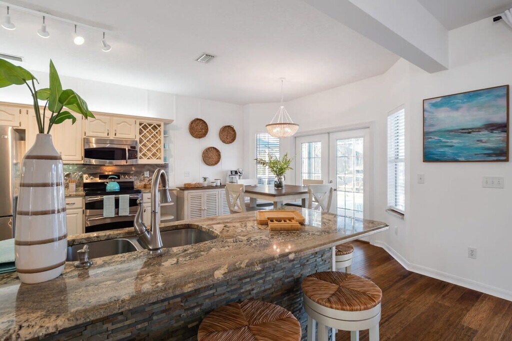 Feel at home in this beautiful Palm Coast saltwater canal home featuring 4 bedrooms and 2 full and 2 half bathrooms, accommodating up to 10 guests. This newly renovated home boasts elegant coastal decor and modern amenities. The kitchen features granite counters, bar seating, and a dining table for 8. Enjoy canal views from most bedrooms and entertainment areas. For your enjoyment, the home includes a large in-ground heated pool and spa with a screened enclosure, 2 kayaks, life jackets, and 2 cruising bikes. Pets are welcome for a fee of $100 plus tax per pet per stay. A pool heater is available for $50 per day, $287 per week, or $200 weekly for multi-week stays. Secure off-site parking for trailers or RVs is available approximately 7-10 miles from the property for $25 per day per unit. Welcome to Palm Harbor, a tranquil family neighborhood nestled in the heart of sailboat country in Palm Coast, FL. Experience the serenity of this area surrounded by miles of scenic walking and biking trails. The beach is just a short 15-minute drive away. Explore the vibrant European Village nearby, offering a variety of shopping and dining options. With convenient access to grocery stores and local eateries, Palm Harbor is an ideal location for a peaceful getaway. Quiet hours are between 10 PM and 7 AM. Trailers and RVs are not permitted to be parked at the property. Additionally, parking on the lawn is strictly prohibited at all times. All vehicles must be parked in the driveway only. The upstairs loft includes a working desk and Bluetooth printer. Registration Number: 28--1 [SI]