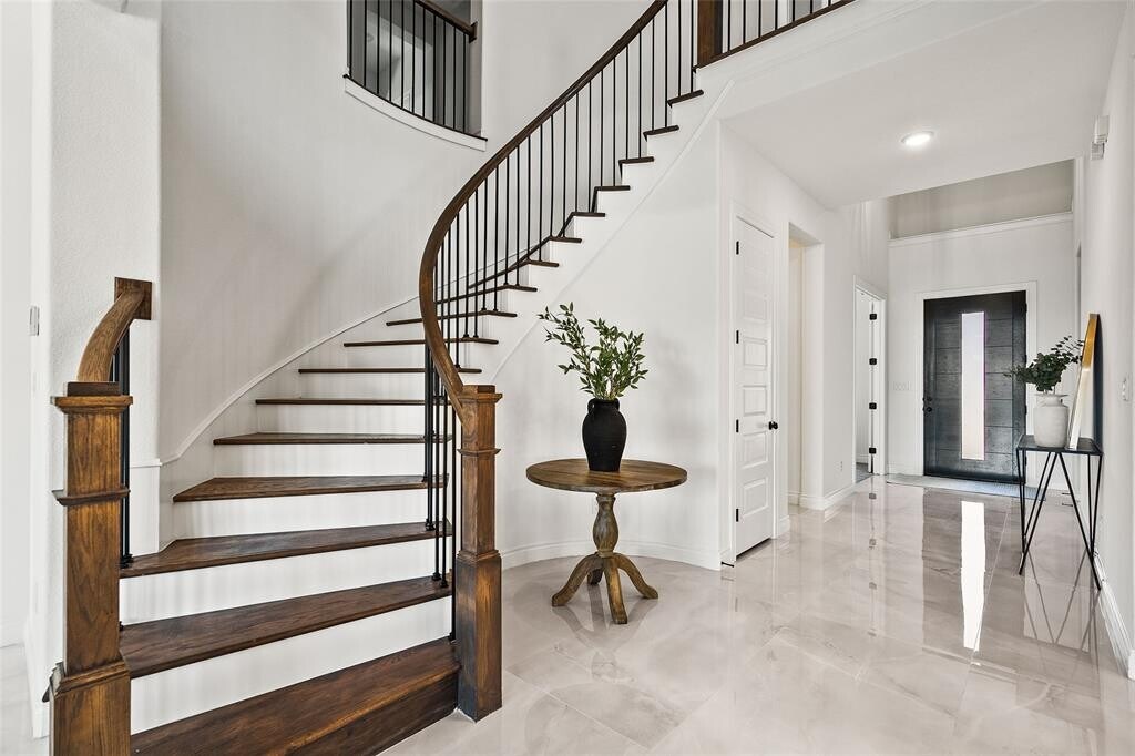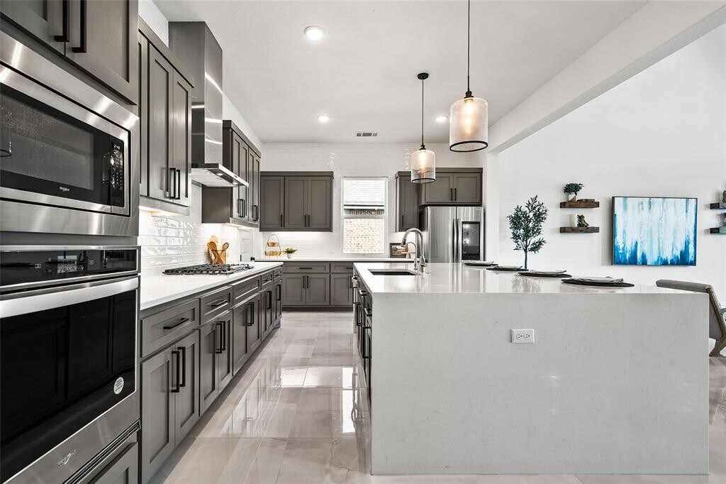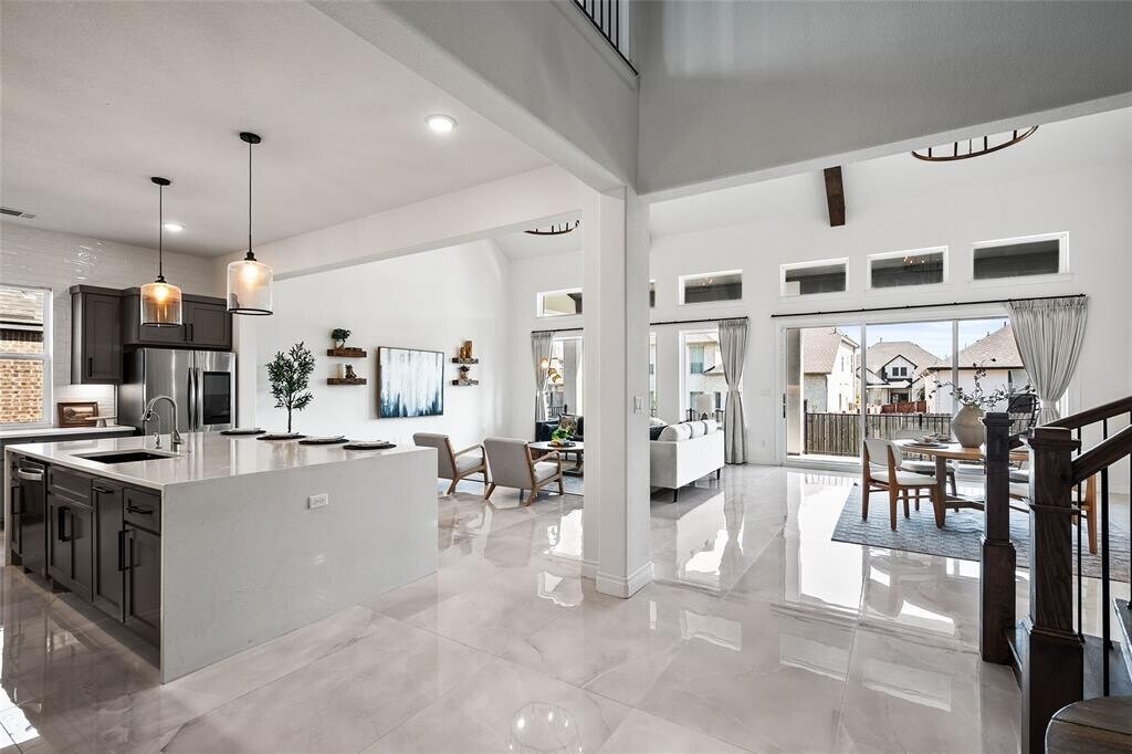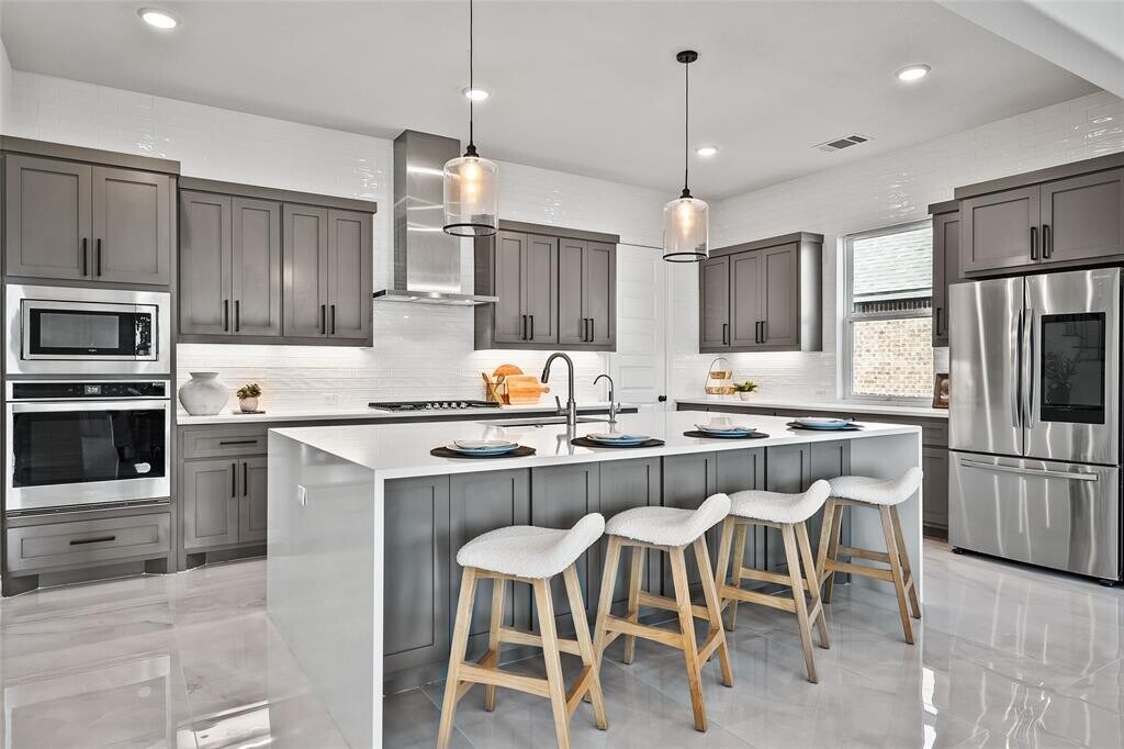Discover modern luxury and timeless comfort in this beautifully maintained and almost like-new Drees Custom Home featuring the award-winning Grantley floor plan. Offering 4,368 sq. ft. of thoughtfully designed living space, this home includes 4 bedrooms, 4.5 bathrooms, a media room, reading nook, game room, and a designated office. The open-concept layout is filled with natural light and enhanced by soaring coved ceilings, creating an elegant atmosphere ideal for both everyday living and entertaining. The expansive living area, with vaulted ceilings and Italian tile flooring, flows seamlessly into the dining and kitchen spaces, where a gourmet kitchen awaits with a designer waterfall island, abundant cabinetry, modern appliances, and generous counter space. Two bedrooms on the main level offer flexibility, while the primary suite provides a spa-inspired retreat with a luxurious bath and dual shower. Additional features include a private office, large game room, and dedicated media room with setup included, as well as a garage gym with equipment provided as a seller incentive. Step outside to enjoy a Texas-sized covered patio overlooking a beautiful 70-ft lot with a lush yard—perfect for gatherings or quiet relaxation. Located in the highly sought-after Oaks at San Gabriel, residents enjoy resort-style amenities including a clubhouse, pool, parks, playgrounds, picnic areas, and scenic trails. Conveniently situated just 15 minutes from Harmony Charter School in Georgetown, this home perfectly blends luxury, light, and lifestyle.