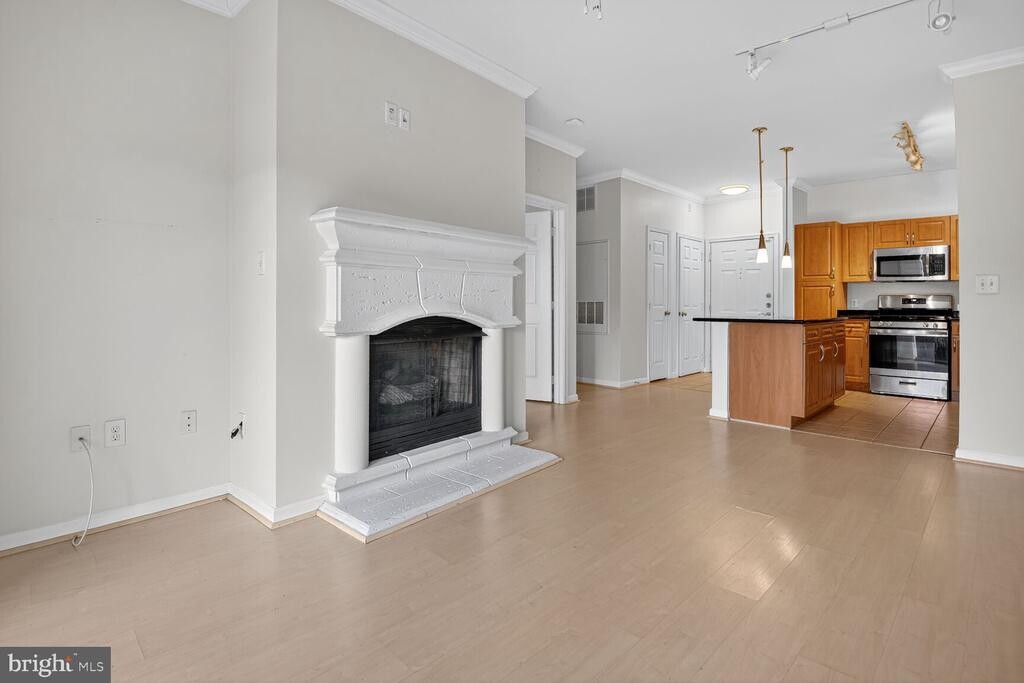 Welcome to 12905 Centre Park Circle, a lovely 1-bedroom condo with covered garage parking in Herndon’s sought-after Bryson at Woodland Park community. Classic hardwood floors flow throughout the living areas and bedroom, while nine-foot ceilings and an open floor plan give the home a spacious feel. The updated kitchen features ceramic tile flooring, 42-inch cabinets with brushed-nickel hardware, stainless-steel appliances, sleek granite countertops, and a useful island illuminated by chic pendant lights with an overhang for bar-stool seating. Elegant crown molding and track lighting add a touch of sophistication to the living room, and the cozy fireplace is perfect for winter evenings. Step out the sliding glass door to your private patio overlooking the serene courtyard—an ideal spot for morning coffee. The roomy owner’s suite offers a large walk-in closet with built-in shelving for added organization, and the en-suite bath includes a deep soaking tub, ample counter space, and a linen closet for towels and accessories. Additional conveniences include an in-unit washer and dryer and two covered garage parking spaces. Bryson at Woodland Park provides luxury amenities such as gated entry, a clubhouse, concierge services, a fitness center, billiards room, business center, and two outdoor pools. Conveniently located minutes from the Herndon Metro with quick access to the Dulles Toll Road, Fairfax County Parkway, Route 28, and Dulles International Airport. You’re also steps from a vibrant shopping center with Harris Teeter, Starbucks, and great dining options, and just 0.3 miles from Reston Town Center—this place truly has it all!