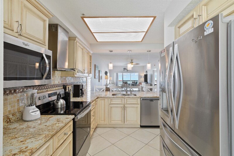 Property Id: 2052718 Crimson #201 is a highly popular 2 bedroom, 2 bath rental that is simply gorgeous with no detail overlooked. Bright and open, you will immediately notice the custom designed kitchen, with all wood maple cabinets, granite countertops, under-mount stainless sink, and stainless steel appliances. With utensils fully stocked, this kitchen would make any chef proud. Added bonus? A built in cooler for all of your favorite beverages! Stylish pendant lighting is over the seated bar. Walking into the large living space, you will find a comfortable leather sectional, 42 inch flat screened TV with DVR and plenty of natural light. But perhaps the most popular area of this sought after home, is the balcony, which offers beautiful beach views. Watch the sunsets or listen to the waves crashing while enjoying a favorite drink or reading a good book.