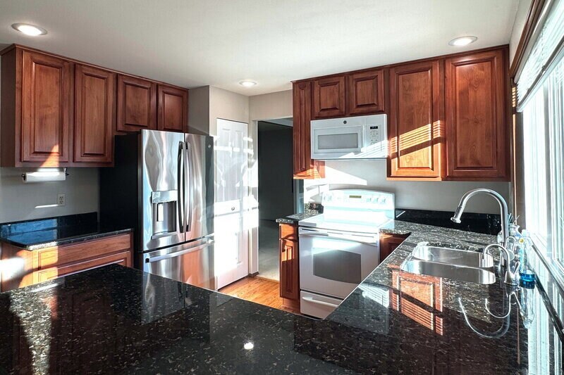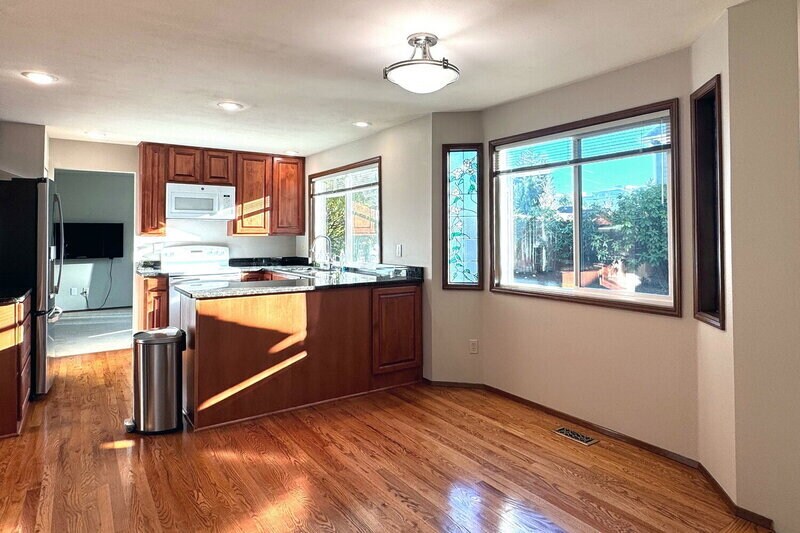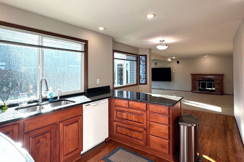 Set in the desirable South Rose Hill area of Kirkland, this expansive 2,490-square-foot home offers four bedrooms and two and a half baths with a layout designed for comfort and versatility. The main living area centers around a welcoming great room featuring a classic wood-burning fireplace and an 85-inch TV with speaker system, creating a perfect space for relaxing or entertaining. The kitchen is thoughtfully appointed with granite countertops, attractive cabinetry, hardwood floors in the kitchen and entry, and a sunny breakfast nook that looks out to the yard adding a casual dining option filled with natural light. The flow between kitchen, dining, and living spaces creates an inviting environment for daily living and gatherings alike. Upstairs, the spacious primary suite provides a private retreat with a sitting room and a five-piece en suite bath, complete with a soaking tub and separate shower. Additional bedrooms offer flexibility for home offices, guest rooms, or creative spaces. Air conditioning keeps the home comfortable throughout the year. Storage and organization are well supported throughout the home, while the two-car garage adds convenience for vehicles and extra belongings. The layout allows for both shared living and private areas, making the home adaptable to a variety of lifestyles. Outside, the fully fenced and landscaped yard features a low-maintenance composite deck and a storage shed, ideal for outdoor dining, gardening, or quiet time outdoors. Landscaping service is included, for pressure free enjoyment. This location provides easy access to I-405 and is just minutes from major employment centers including Microsoft and Google, as well as downtown Bellevue, Redmond, and the Kirkland waterfront. Nearby parks, trails, shopping, and dining options further enhance the appeal of this well-located Kirkland home. Pet Details: Dogs and cats. No more than 3 total