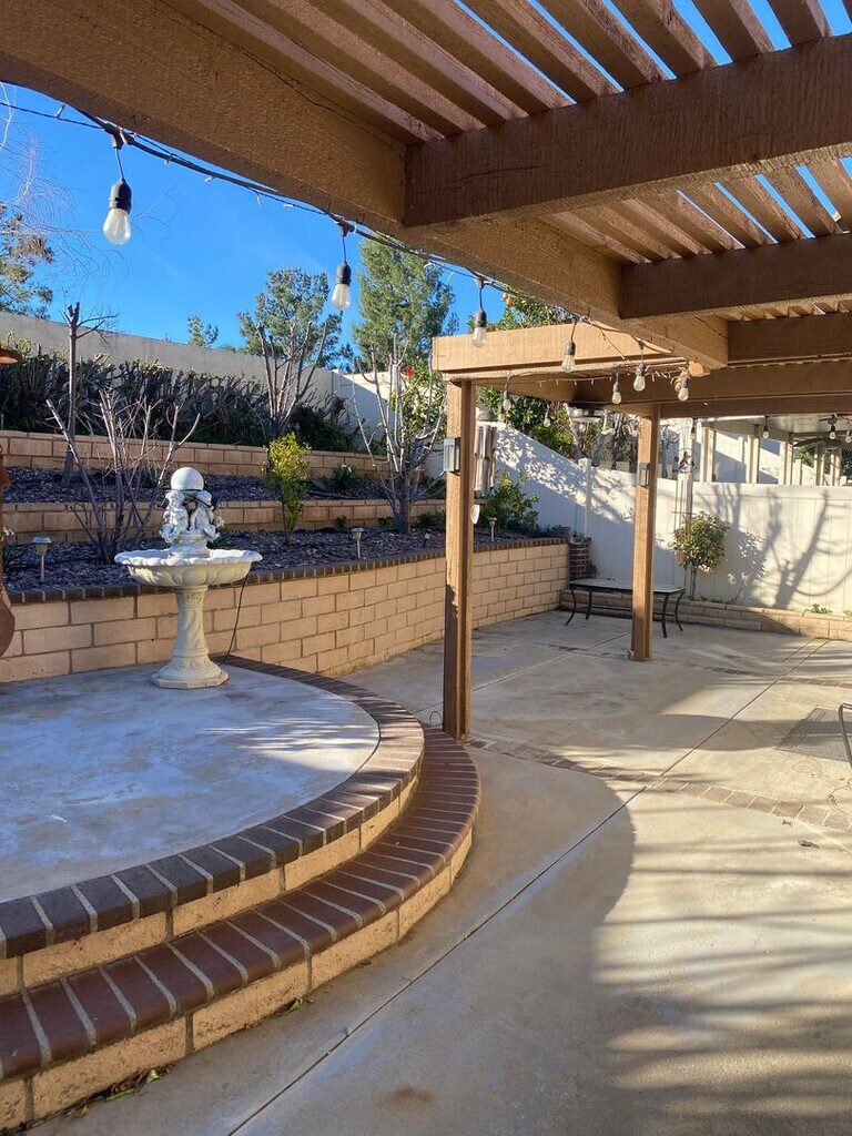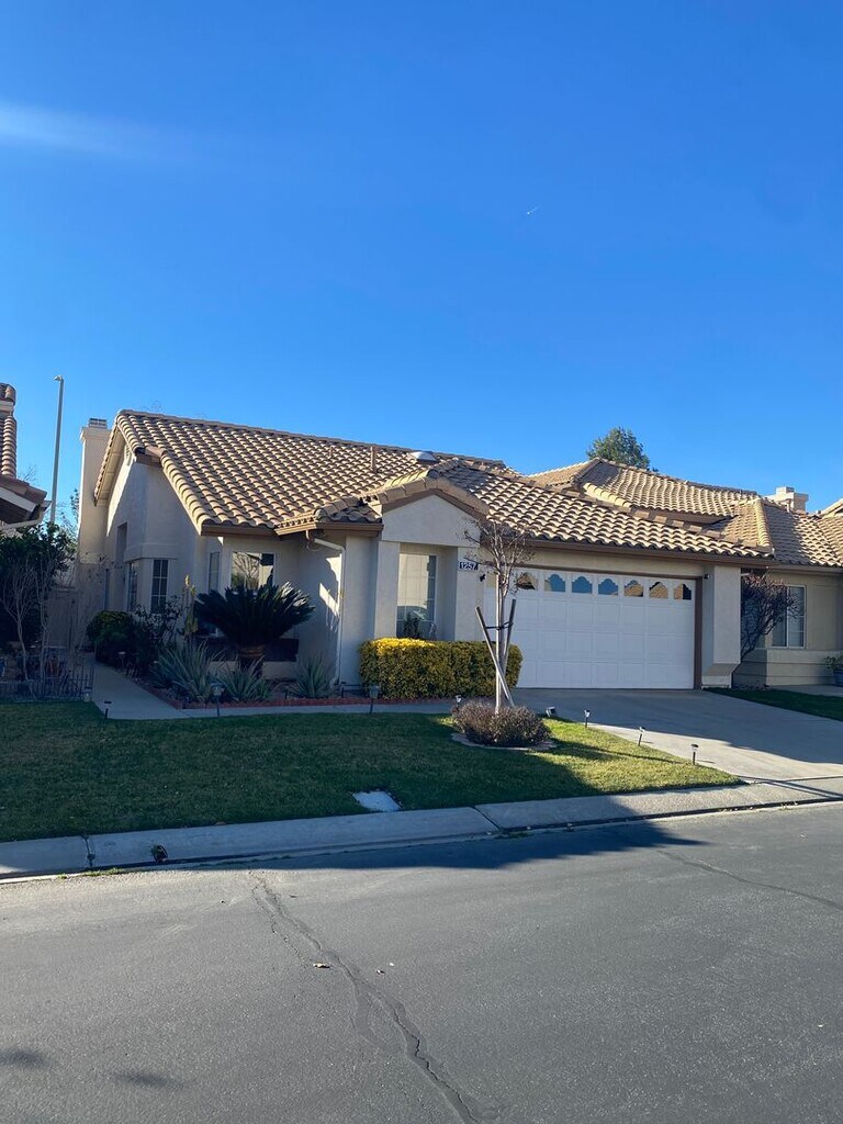 Available for rent in the Inland Empire's premier gated senior community, Sun Lakes, this beautifully maintained 2-bedroom, 2-bath home with a den offers comfort, convenience, and low-maintenance living. The home features fresh interior paint, high ceilings, and a well-designed floor plan. The living room is enhanced by a cozy fireplace and vinyl plank floors. Sliding doors from the Living Room, Kitchen Nook and Primary Bedroom bring fresh air and sunshine into this lovely home. The kitchen offers ample storage, a breakfast nook, and connects to the dining area. Additional interior features include ceiling fans, new blinds and abundant storage throughout. The backyard is the icing on the cake, it includes a brick-trimmed covered concrete patio, brick-trimmed planters, a stucco privacy wall, and beautifully landscaped grounds with mature fruit trees (plum, cherry, and apple). Gardener service is included. Additional highlights include a solar system, 2-car garage, security screen door, smart doorbell, and security cameras. Internet and cable are provided by the HOA, adding exceptional value. Enjoy a quiet, resort-style lifestyle with access to Sun Lakes community amenities - Indoor and outdoor pools, 3 clubhouses, pickleball, tennis, a 27 hole golf course, a gym, a restaurant and bar, many, many social clubs and activities. You will never be bored living in this stunning community.