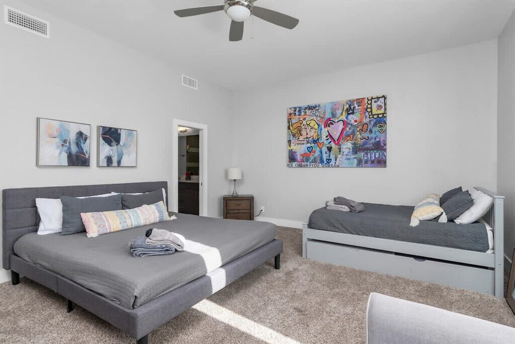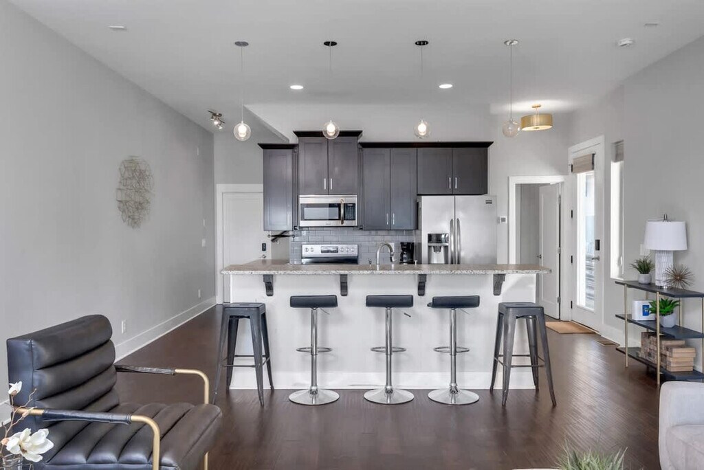 Come and feel at home in this thoughtfully designed 2,000 sq ft Nashville home. This home has 3 bedrooms and 3.5 baths and features a rooftop patio and private hot tub. You’ll find subtle nods to the iconic Eras of Taylor Swift all throughout the home, including a picturesque mural of the legend herself. Enjoy an open floor concept, bar seating, and a fully stocked kitchen. There is also a huge wrap-around rooftop deck with amazing views of Nashville. Enjoy the shared backyard. Two-car garage parking is available. Located in North Nashville, this home is just 4 miles to Broadway and all that downtown has to offer. Nearby places to visit include Butchertown Hall (8 mins drive), Redheaded Stranger (4 mins drive), The Optimist (8 mins drive), Tennessee State Museum (7 mins drive), and Musicians Hall of Fame and Museum (8 mins drive). The backyard and hot tub deck are shared with the home next door, so please be respectful of all neighbors. Smoking and parties are not allowed. [SI]