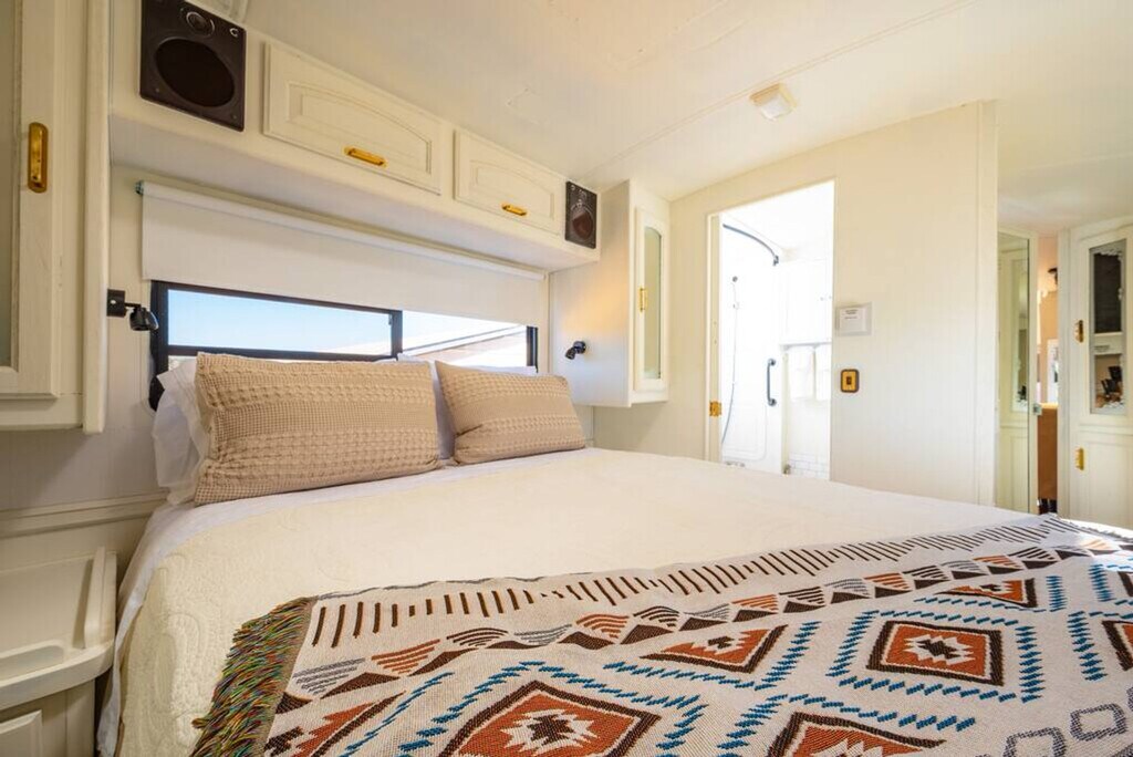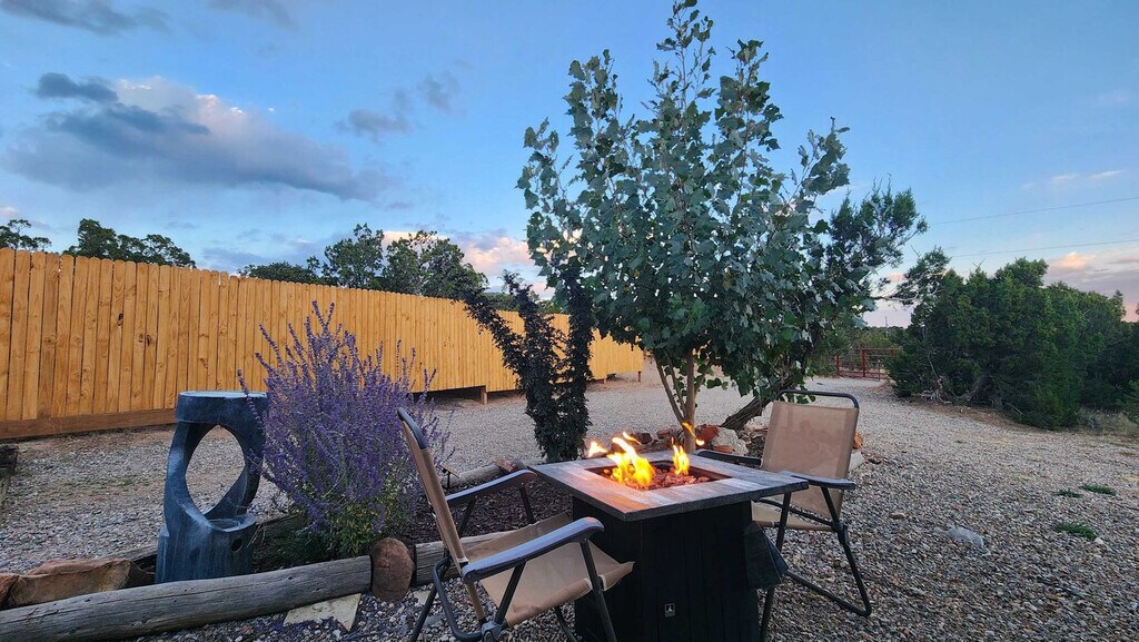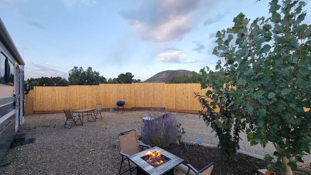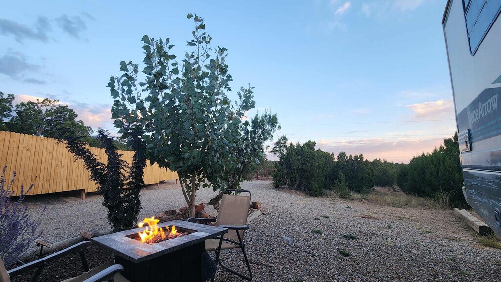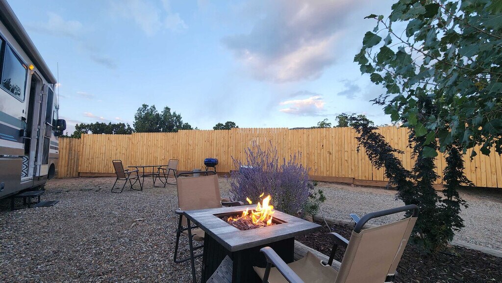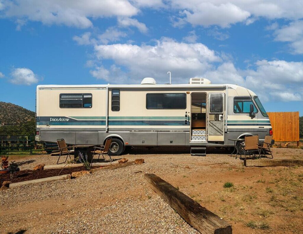 Welcome to this charming RV, nestled in the serene outskirts of Santa Fe. Escape the hustle and bustle of the city and immerse yourself in the beauty of nature while enjoying the comforts of modern living. Located just 15 minutes from the plaza, you can easily enjoy all that Santa Fe has to offer. Step inside and be captivated by the warm and inviting ambiance of the well-appointed living space. Recently renovated, the interior showcases a thoughtfully designed layout that maximizes comfort and functionality. Relax in the comfortable seating area, where you can unwind and enjoy breathtaking views of the surrounding natural beauty or stream a show on the Smart TV. The fully functional kitchen is equipped with modern appliances and stocked with all the necessary cookware, providing everything you need to prepare delicious meals. After a day of exploration, retreat to the cozy bedroom featuring a plush queen-size bed and a TV equipped with a Roku player. The RV also features a modern bathroom with all the essential amenities. One of the highlights of this RV experience is the outdoor gas firepit, perfect for relaxation and enjoying the peaceful beauty of the natural surroundings. Baby equipment is available on a first-come, first-served basis for an additional fee. More details can be provided if you are interested. Beyond the comforts of your temporary home, Santa Fe beckons with its rich cultural heritage and vibrant art scene. Explore the nearby art galleries, museums, and historic sites that showcase the city's unique charm and history. Take scenic hikes or leisurely strolls amidst the foothills, immersing yourself in the awe-inspiring beauty of nature. The TVs do not have traditional cable but can stream Netflix, Hulu, and more using your account. There is an A/C in the main area as well as the bedroom. Being an RV, it has everything you need for a great stay, but it does have its limitations. There is a potential for noise outside from the highway. The landscaper comes every other Monday to clean up around the patios, driveway, and yard areas. Quiet time outside starts at 10 pm. After your departure, an inspection of the property will be conducted and any damage or excessive cleaning will be charged to your card on file. Smoking indoors is not allowed and you will be charged a $500 cleaning fee if you smoke in the house. Pets are not allowed and if evidence of a pet is found, a $300 cleaning fee will be charged. Off-street parking is limited and varies by house. One vehicle is allowed in a studio and one-bedroom house. Check-in and check-out times are specified in the house manual or booking confirmation. Late check-out without approval may incur a fee of $40 per hour if it interferes with the next guest's check-in time. The RV is equipped with Wi-Fi, allowing you to stay connected even while enjoying the tranquility of nature.