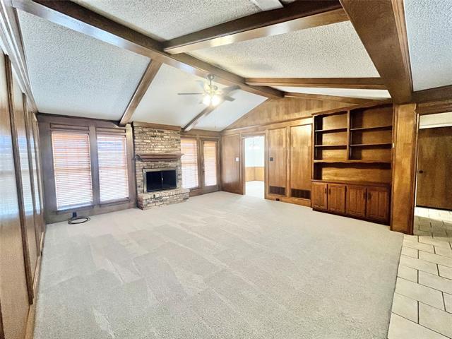 Step into this pristine three-bedroom, two-bath retreat nestled in a peaceful, established neighborhood. The inviting living area welcomes you with custom built-ins, a cozy woodburning fireplace, soaring vaulted ceilings accented by rich wood beams, and elegant picture frame paneling. Enjoy meals in the dining area, bathed in decorative lighting and offering a lovely view of the backyard. The kitchen is a chef's delight, featuring a breakfast bar, electric cooktop, refrigerator, and abundant storage. The spacious primary bedroom boasts an ensuite bathroom with an oversized vanity, while two additional bedrooms and a second bathroom provide comfort for family or guests. A separate utility room with built-in cabinets adds convenience. Step outside to a fenced backyard with a patio area and a handy storage building. The two-car garage and prime location make this home truly special. Come see it for yourself!