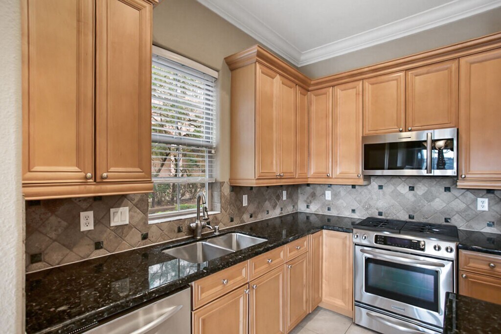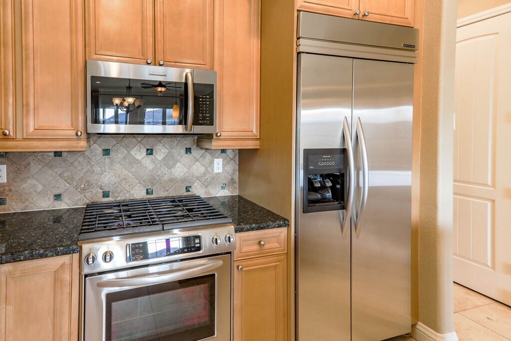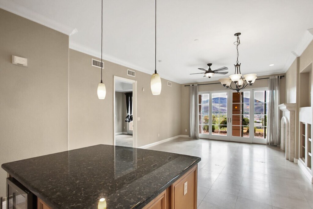 Beautifully upgraded Lake Las Vegas 1st floor condo with stunning mountain and golf course views from the over sized covered patio; Tile throughout makes this an easy to care for home; Island kitchen with breakfast bar, Granite countertops, stylish backsplash, wine fridge, pantry and stainless appliances including refrigerator, microwave, gas range and dish washer; Bright, open, living room with ceiling fan, light, cozy gas fireplace, and double French doors that lead to the covered patio; Primary suite with recessed lights, cable outlet, closet and walk in closet, deep, relaxing, soaking tub and separate shower; Guest bedroom with cable outlet, closet and connecting bath; Guest bath with walk in shower; Laundry room with washer, dryer and cabinets; The V offers gated community, community pool, spa, fitness center, guest parking, and much more! (Total Rent: $2165 - $2100 Rent + $45 RBP + $20 Trash)