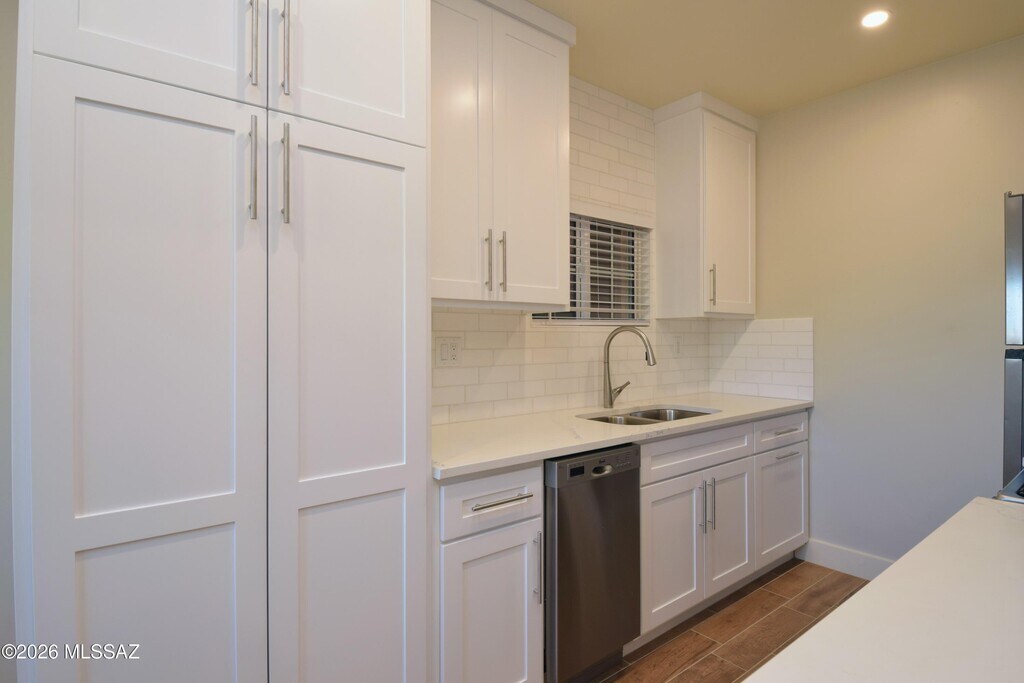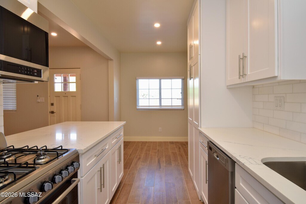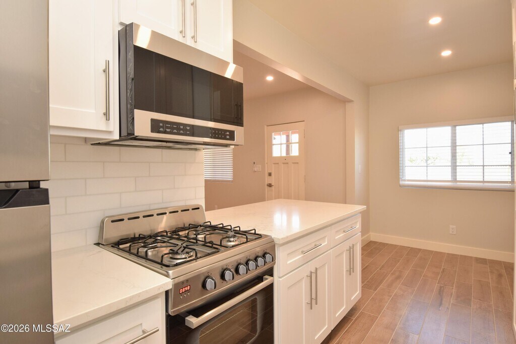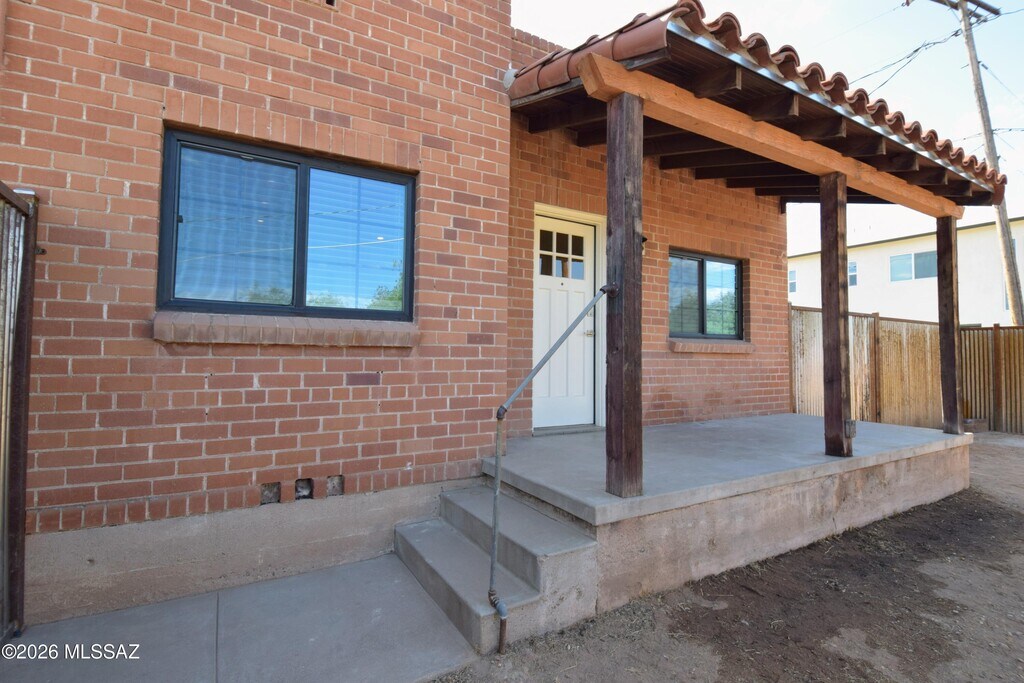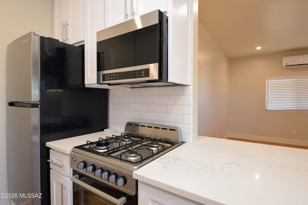 Pre-Leasing for August 2026. DO NOT DISTURB TENANTS. Showings are available with a 48 Hour Notice to the current renovated 1 Bed 1 Bath Casita less than half a mile from the University of Arizona. 576 SQ FT. You can see the ''A'' on Arizona Stadium from the front porch. Beautifully refinished original Golden Oak hardwood floors in the living room and bedroom with brand new tile in the kitchen and bathroom. The modernized kitchen has white shaker cabinets, quartz countertops, and new stainless steel appliances that include a stove, refrigerator, microwave, dishwasher and stackable washer/dryer. Full-size bathroom with oversized marble vanity and walk-in shower. LED lighting throughout. MLS ID 22609643