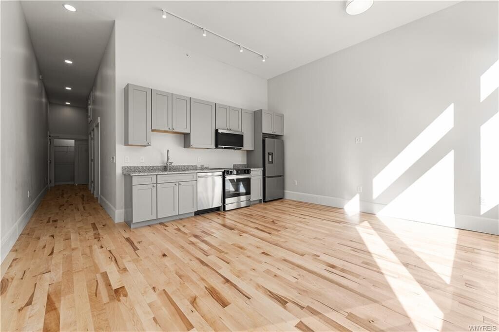 Welcome to the newly converted 130 Pearl St! A once bustling office building transformed into luxury apartments. This charming 2-bedroom, 1-bath apartment offers an unbeatable location with stunning views of St. Paul's Church and the vibrant downtown skyline. Featuring a spacious layout with beautiful natural light, this unit includes a full kitchen with top-of-the-line appliances—fridge, dishwasher, stove, oven, and microwave. The bathroom is complete with a stylish Jack-and-Jill sink setup, and the apartment also boasts in-unit laundry for your convenience. The building offers a range of amenities including a communal fitness center, large washers and dryers, and even a dog washing station. Perfectly situated within walking distance to the Theater District, Sahlen’s Field, and KeyBank Center, this location offers easy access to all the entertainment and dining options downtown Buffalo has to offer.
