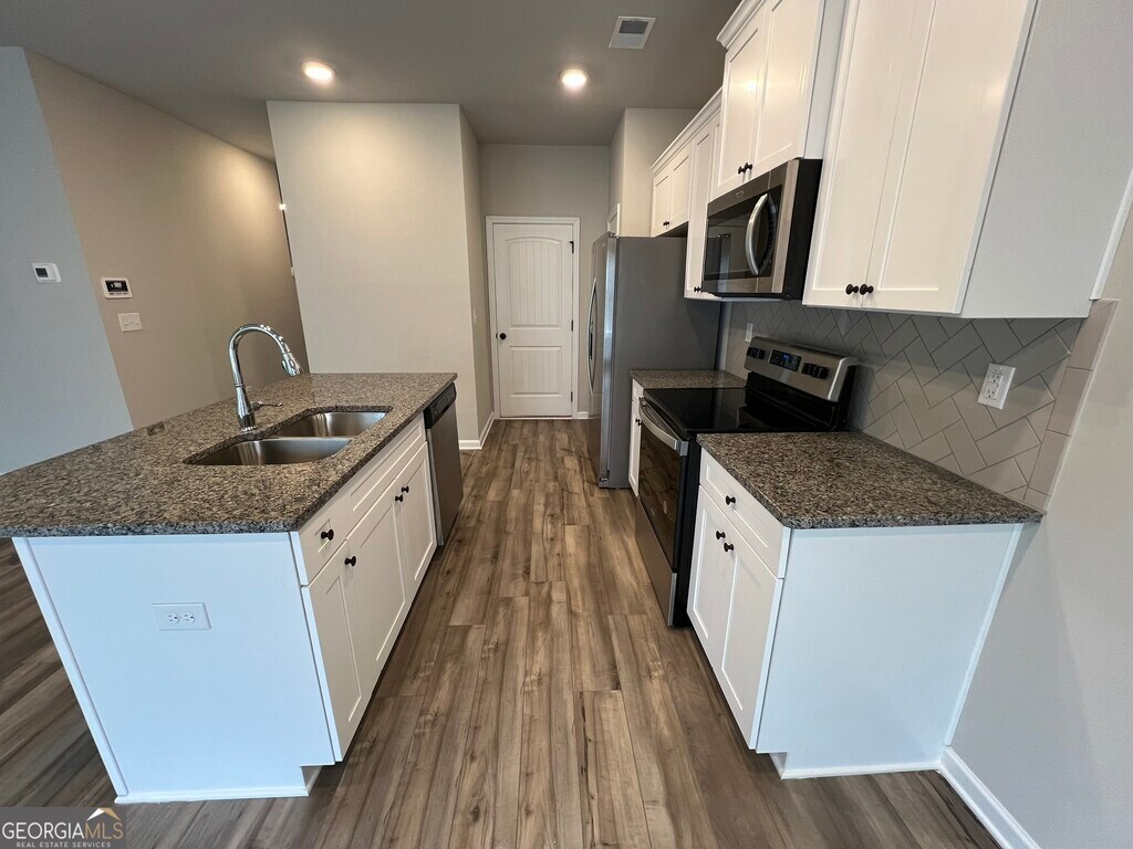 3 bedroom, 2.5 bath townhome featuring an open concept main floor with an oversized foyer, spacious family room, kitchen with granite countertops, stainless steel appliances & tile backsplash, breakfast bar, breakfast room, pantry and half bath. Upstairs showcases an oversized master bedroom with sitting area, walk-in closet, master bath with dual granite vanity and huge shower, two large guest bedrooms, hall bath with granite vanity and a laundry closet. The unit also features a covered front entrance, back patio with privace fence on both sides, single car garage with automatic opener and convenience to schools, dining, shopping and I-20.